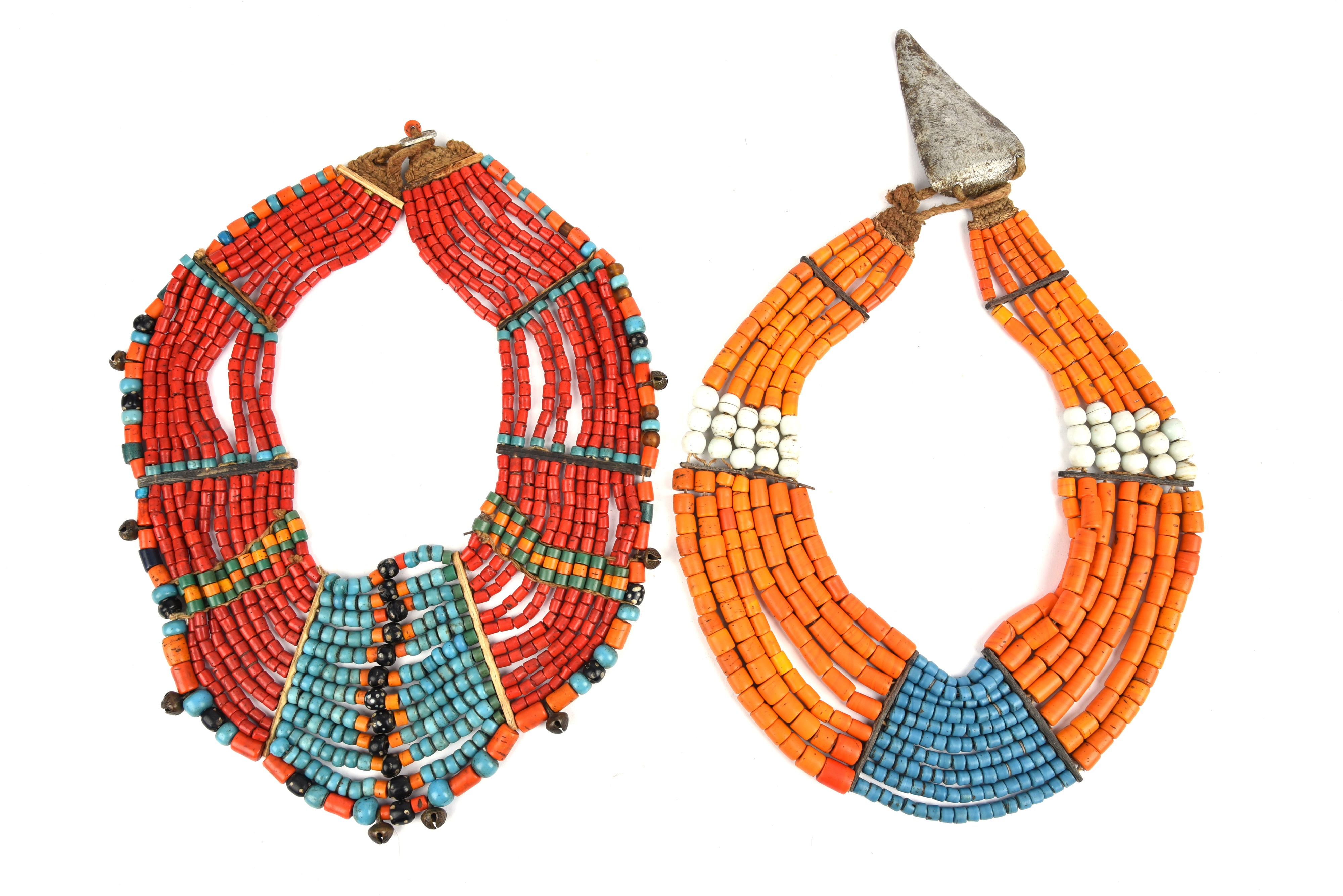 coloured glass beads and bone spacers, one with an aluminium chank shell shape clasp and the other with a square aluminium clasp and with bell pendants,