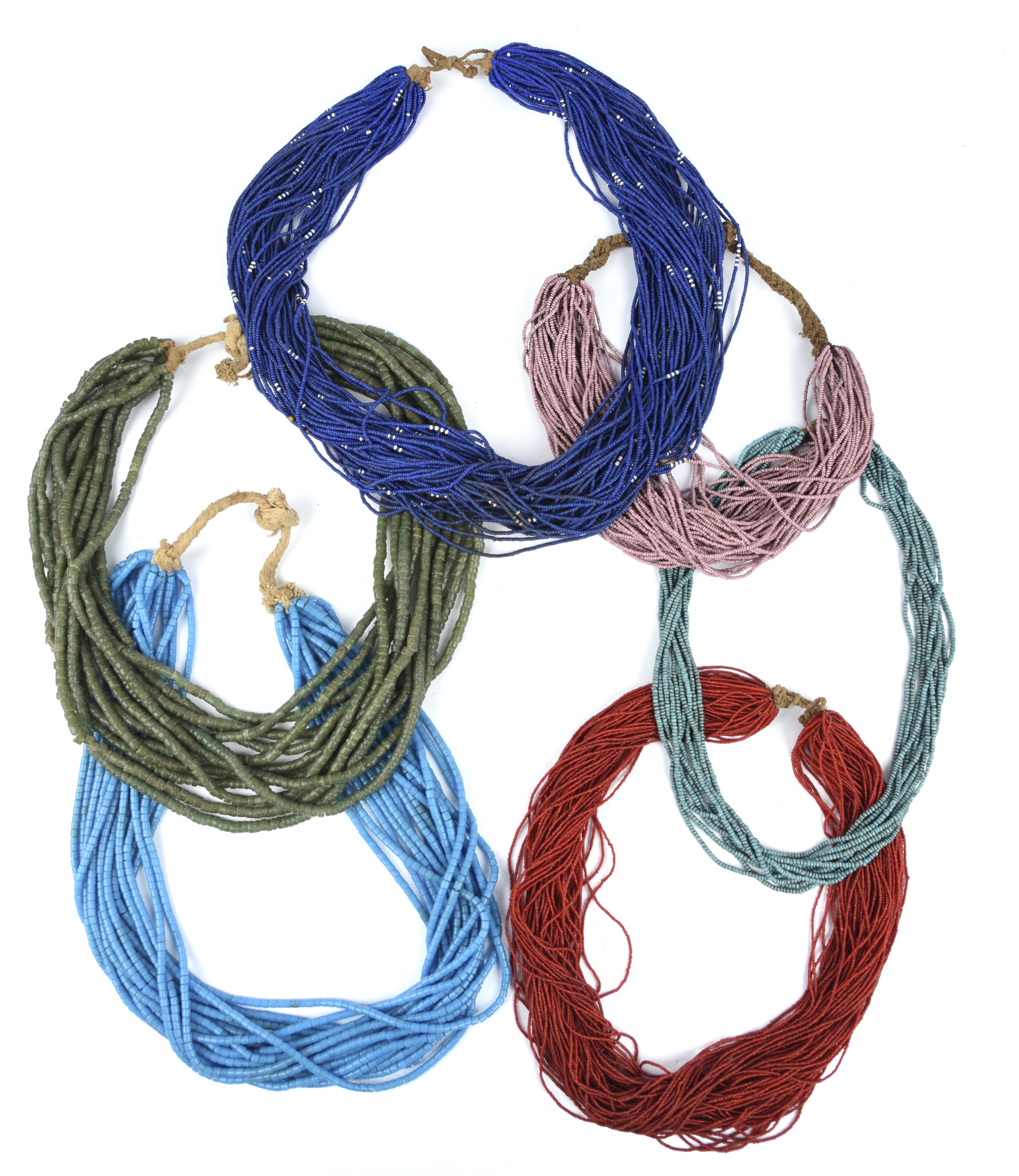 and two Tibetan mala beads, including one with wood, stone and shell beads with two strands of iron discs and bell pendants, 57cm long, another with rudrakska beads, 45.5cm long. (8)