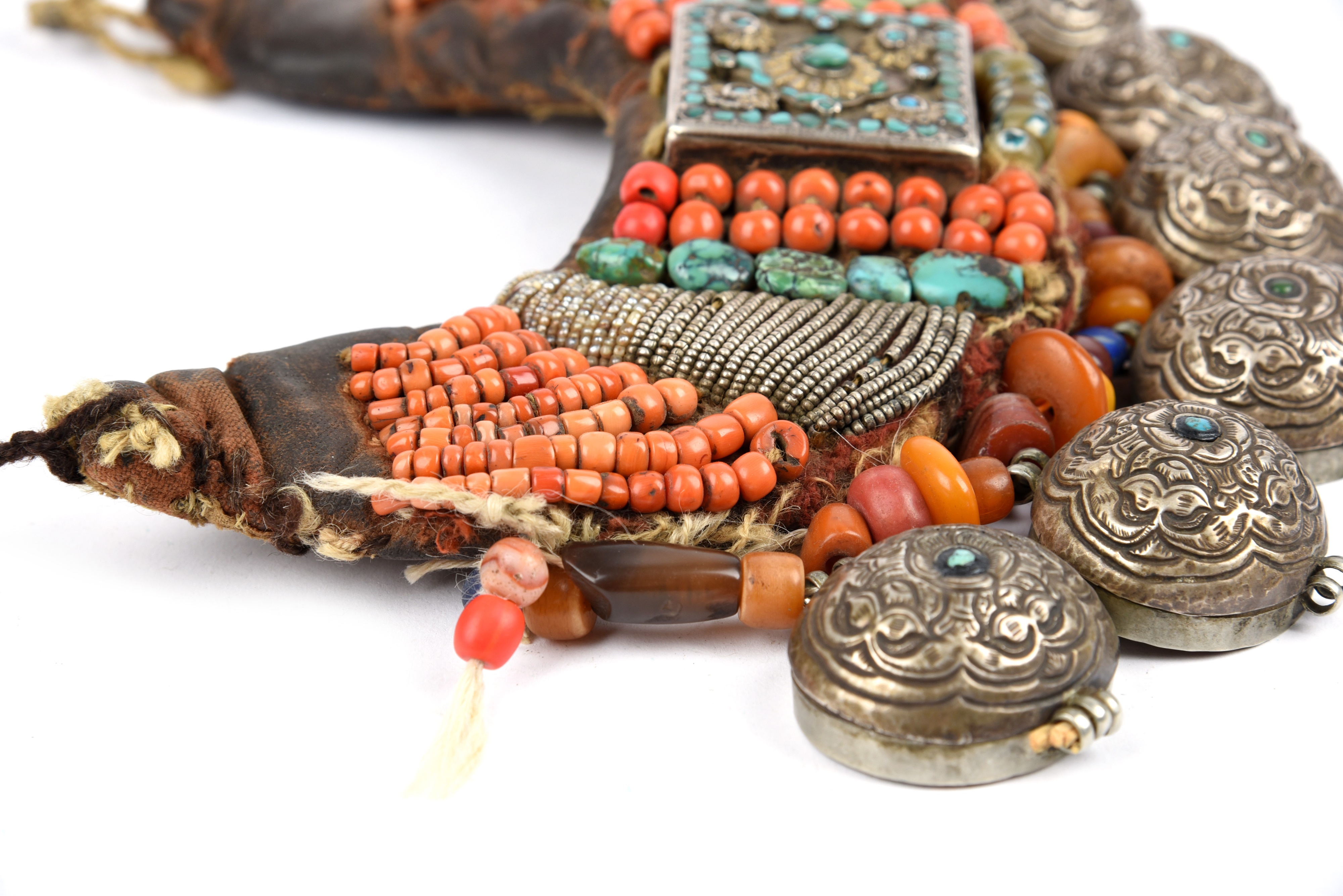 the fabric and wool gorget with coral, turquoise, glass and silver coloured metal beads, with a central square amulet box, hung with further glass and stone beads and seven repousse silver coloured metal and copper oval domed amulets,