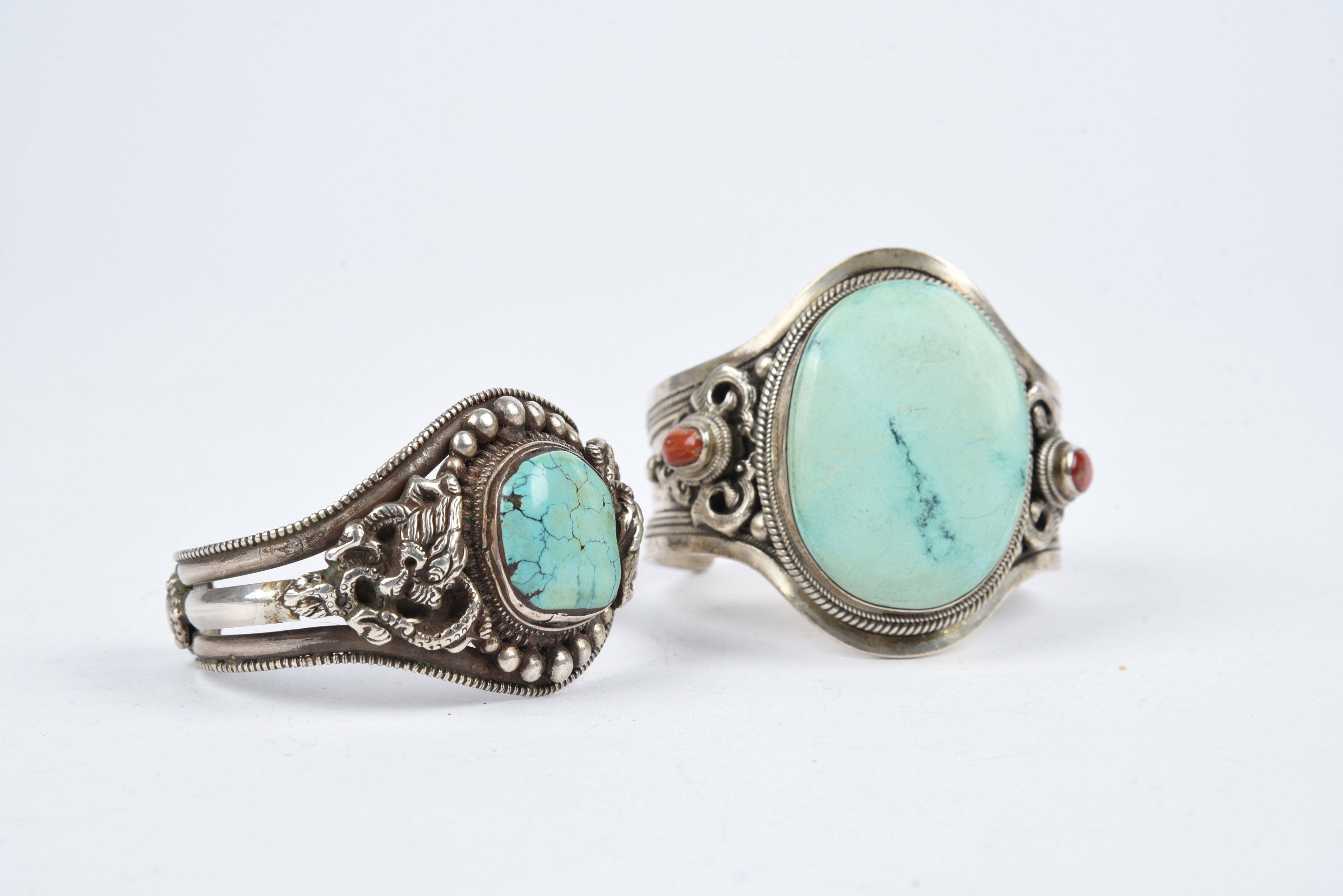 silver coloured metal and inset turquoise, one with dragons and lion heads, stamped 800 ML, the other with scrolls and inset coral, 7.5cm and 7.2cm wide. (2)