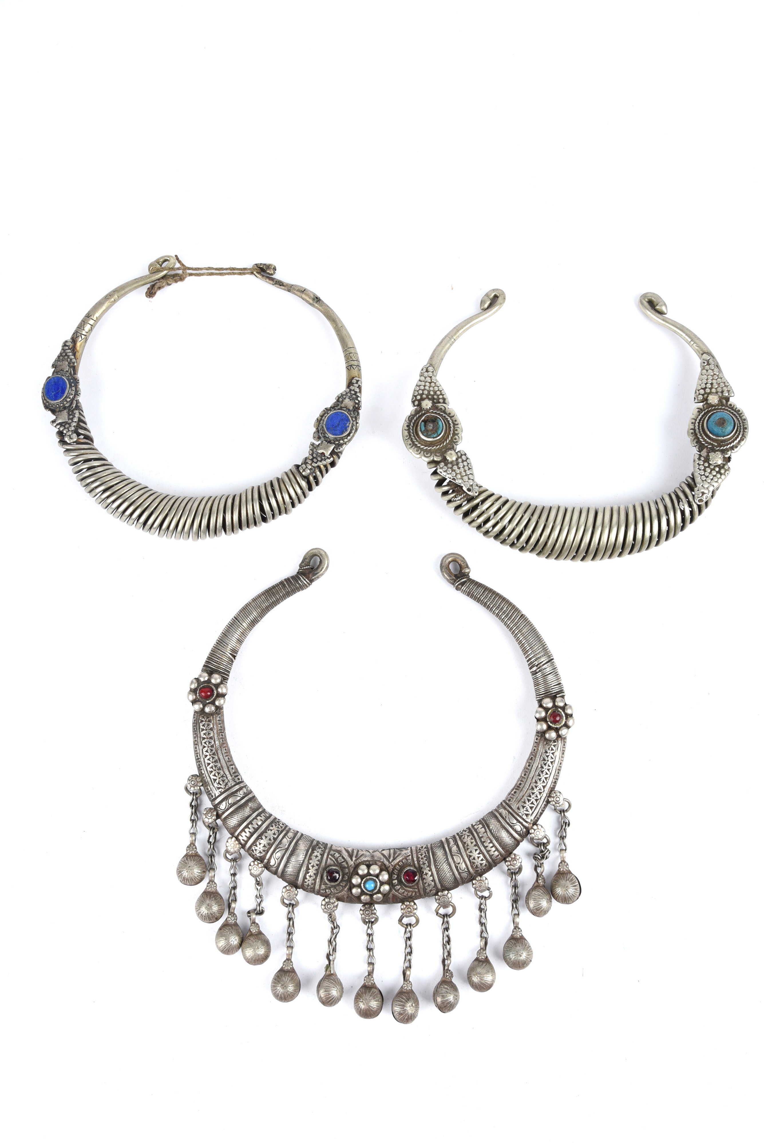 silver coloured metal with applied blue stone and red and blue glass beads, the larger with chased decoration and hung with bells, 20.5cm wide. (3)