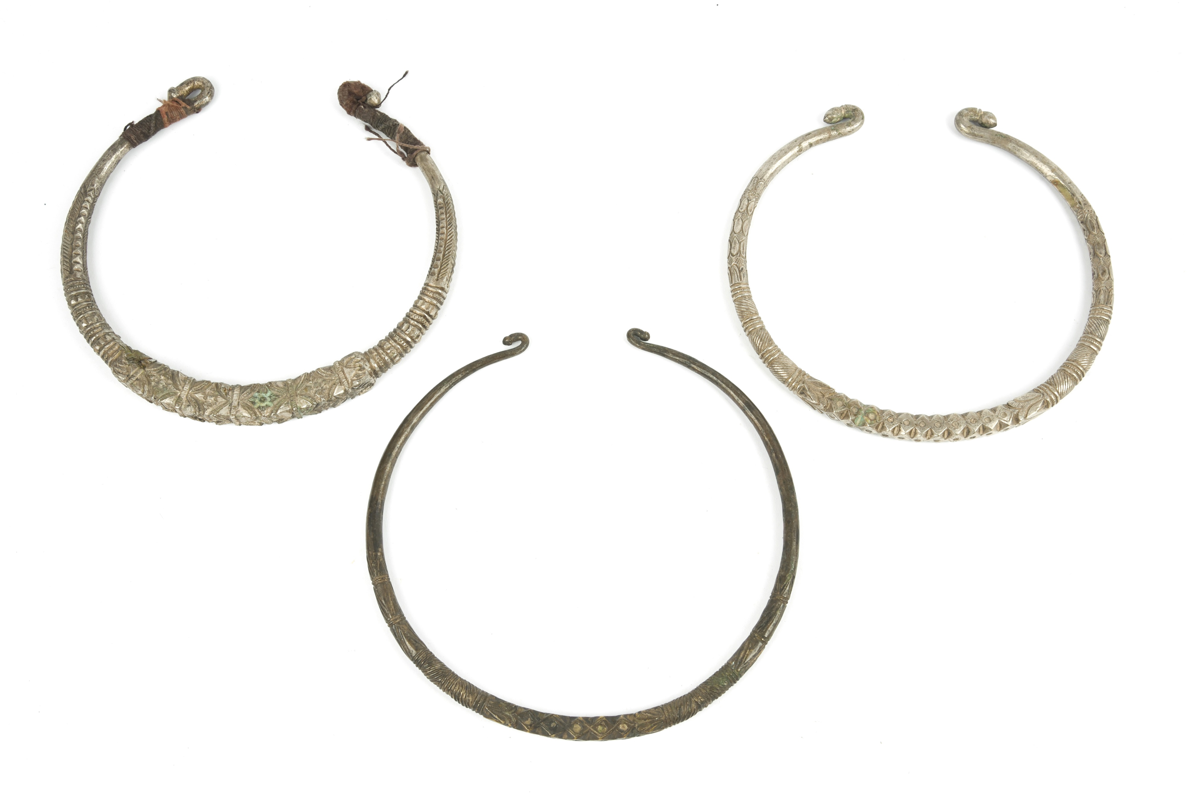 cast base metal and bronze with chiselled decoration, one with fibre binding,