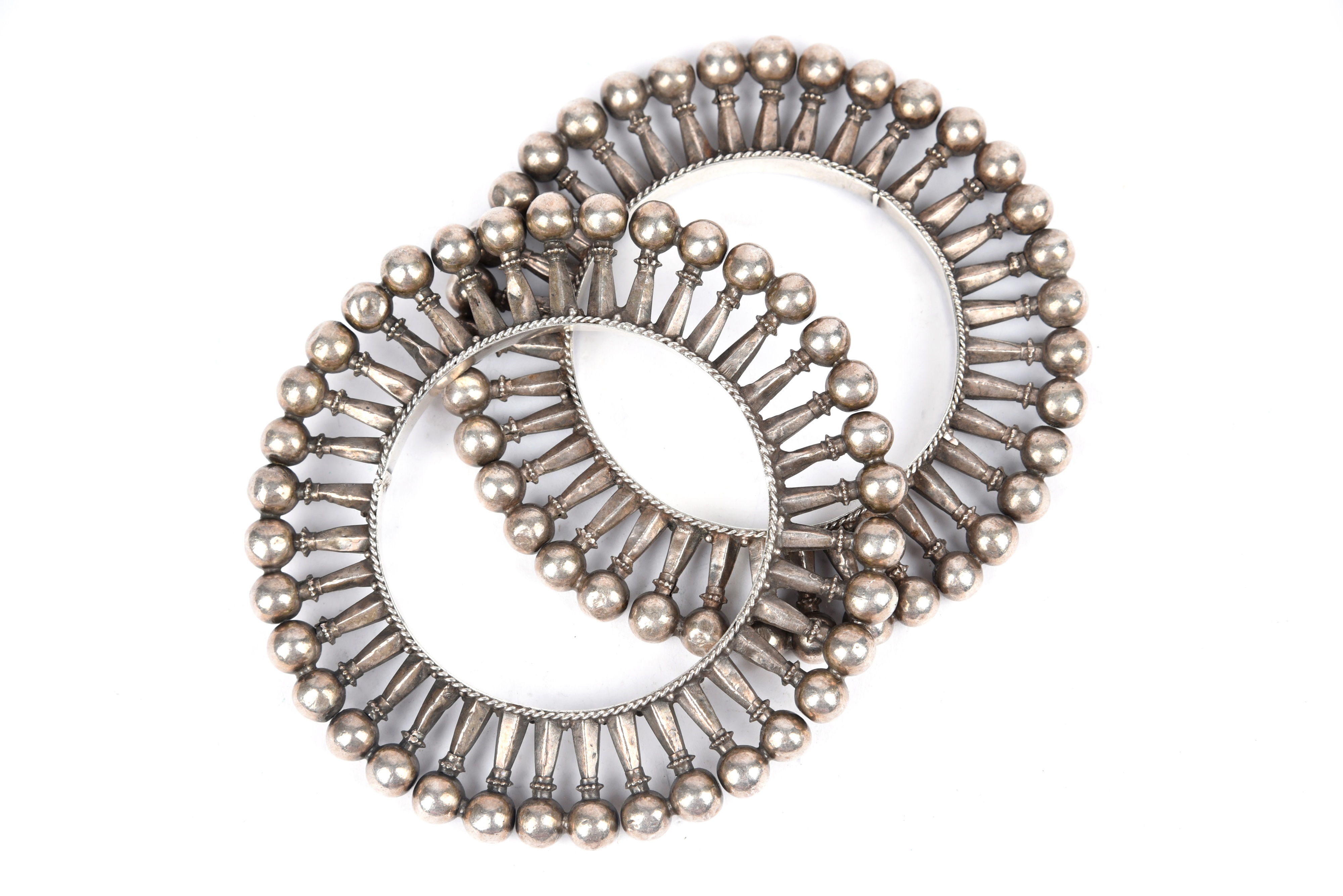 silver coloured metal with thirty six spheres on collared faceted cones,