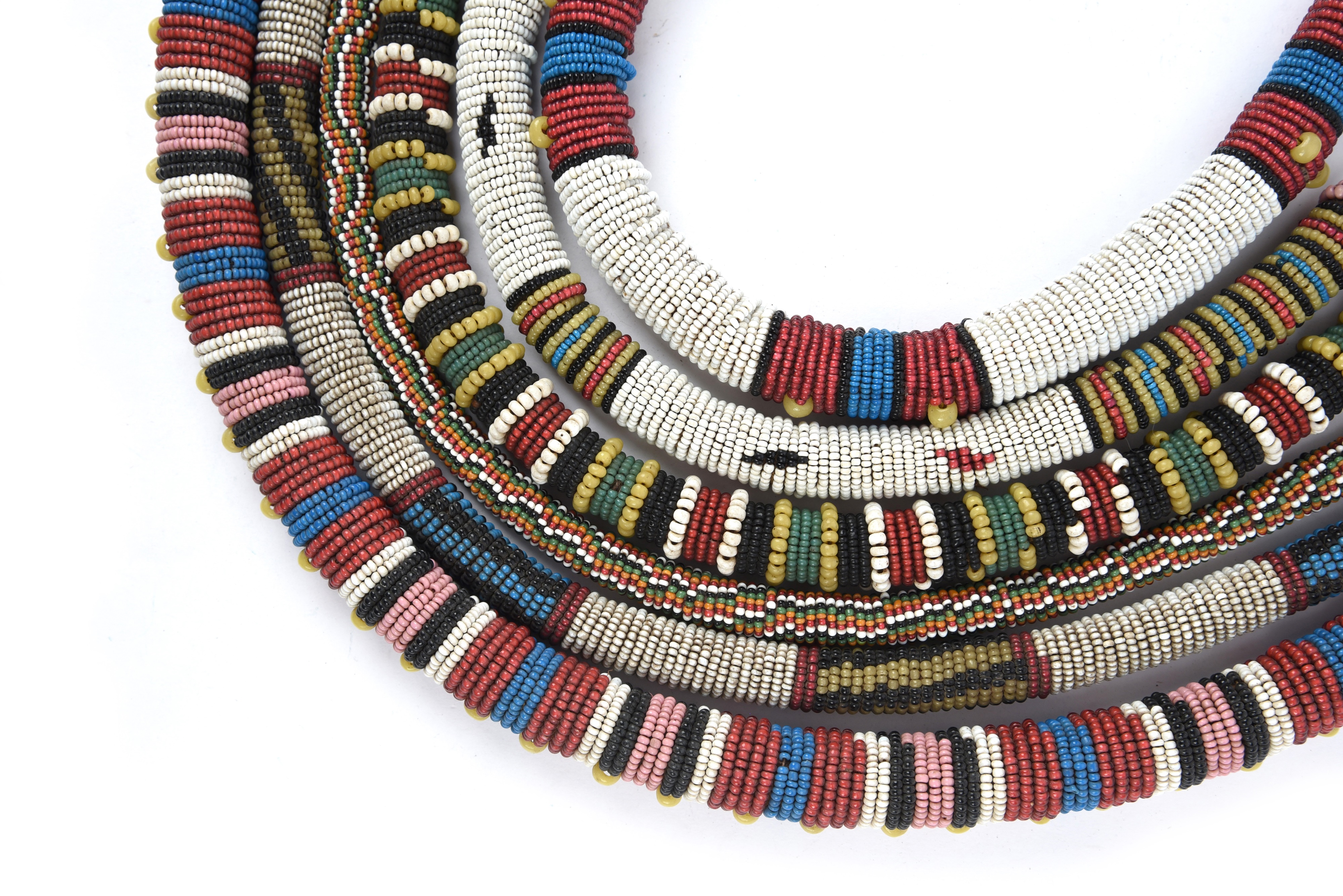 three South African beaded waistbands, three South African beaded panels and seven Zulu neckbands, coloured glass beads, one with a bone ring pendant with incised dot decoration, 31cm wide, and three with brass button fasteners. (16)