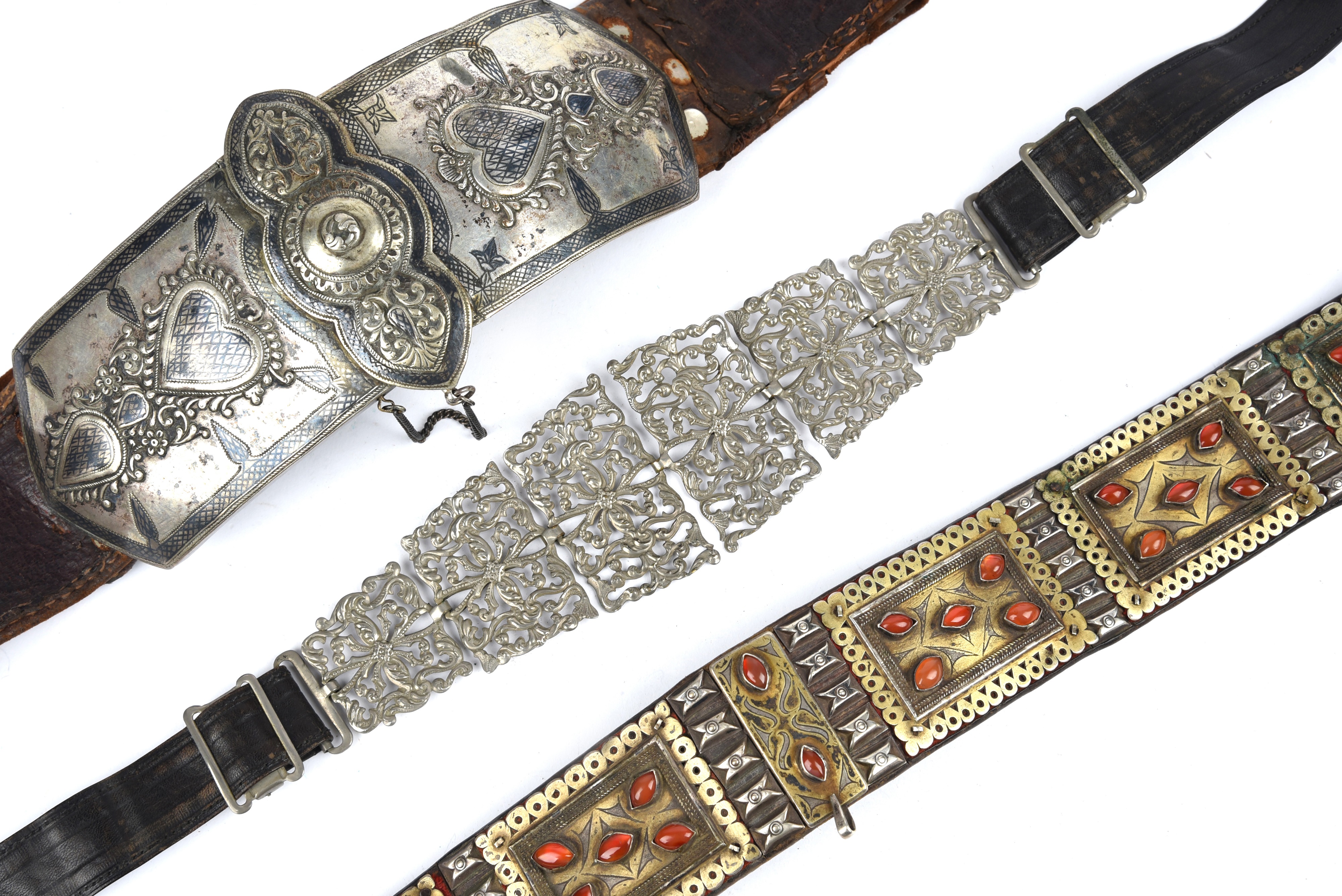 a Turkoman belt, leather with silver and parcel gilt panels and studs with carnelians, 86cm long, and a belt with a graduated stamped and pierced foliate metal panels, with leather straps and matching buckle, 77cm long. (3)