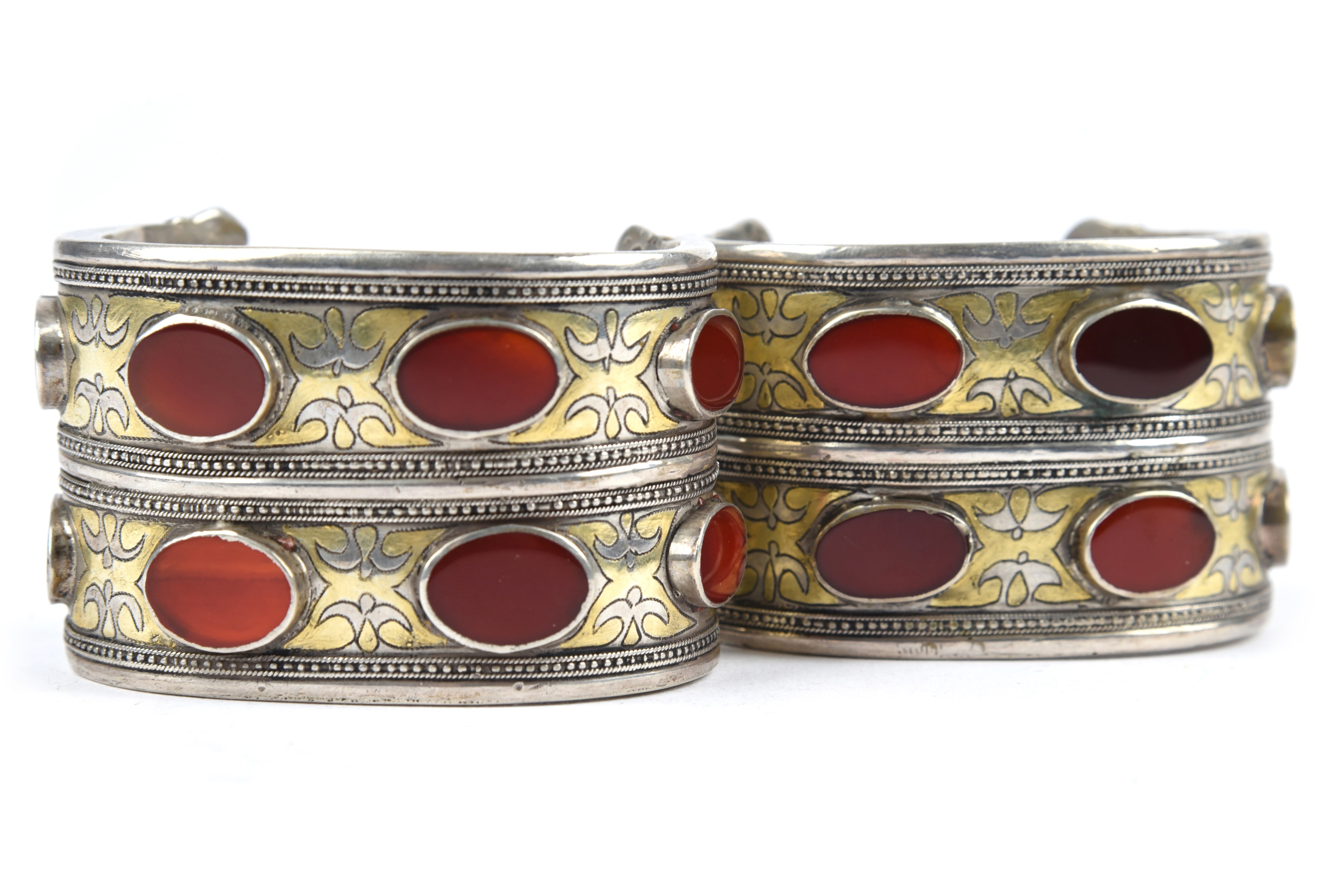 silver coloured metal, parcel gilt and each with eight inset oval carnelians,
