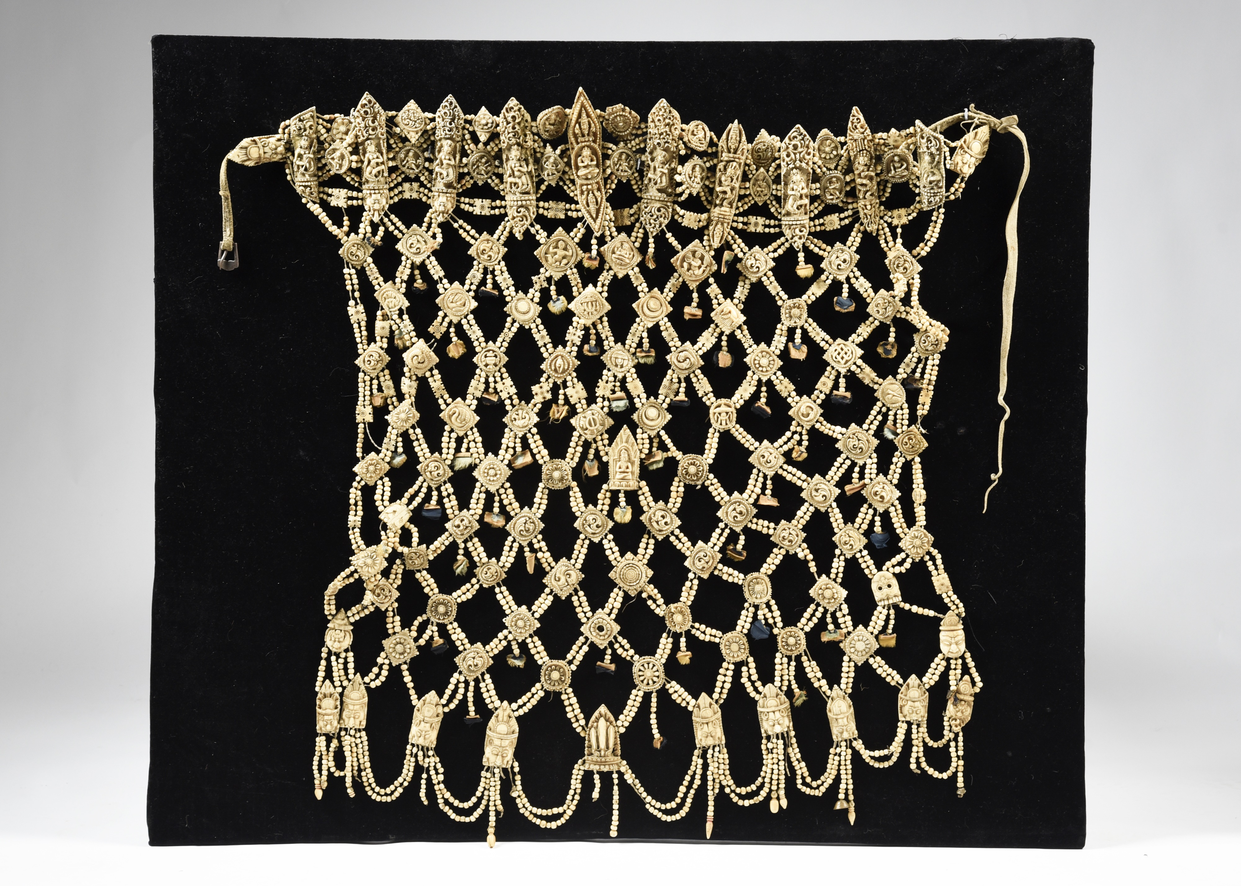 carved bone beads and plaques, the ten belt panels relief carved female deities, dakinis, linked by further figures and symbols, above a lattice body of square and circular plaques of flowers, scrolls, masks, a skull, crescents and suns, a plumed headdress, a peacock and other birds, auspicious symbols and a central seated buddha, with silk and bell pendants,