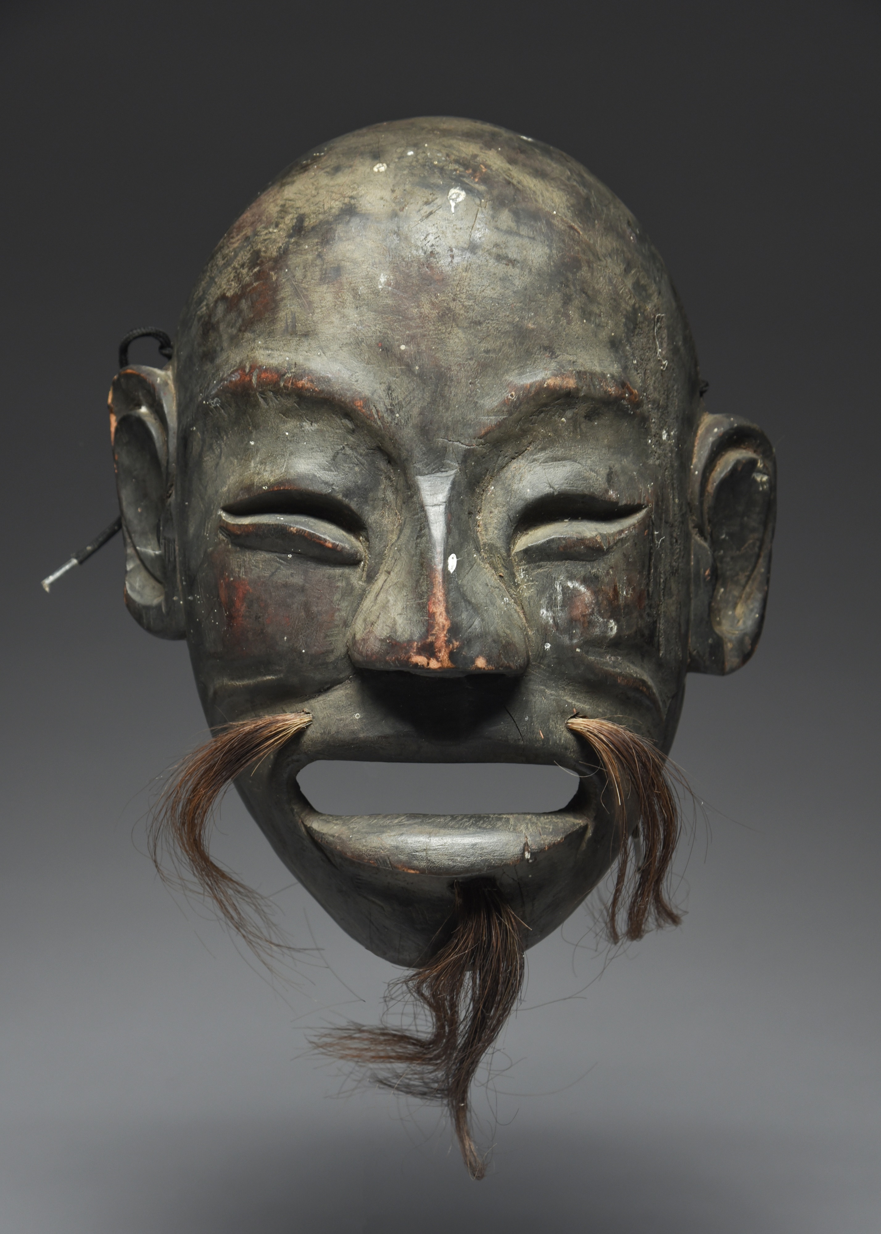with an open mouth, pierced nostrils and inset tufts of hair,