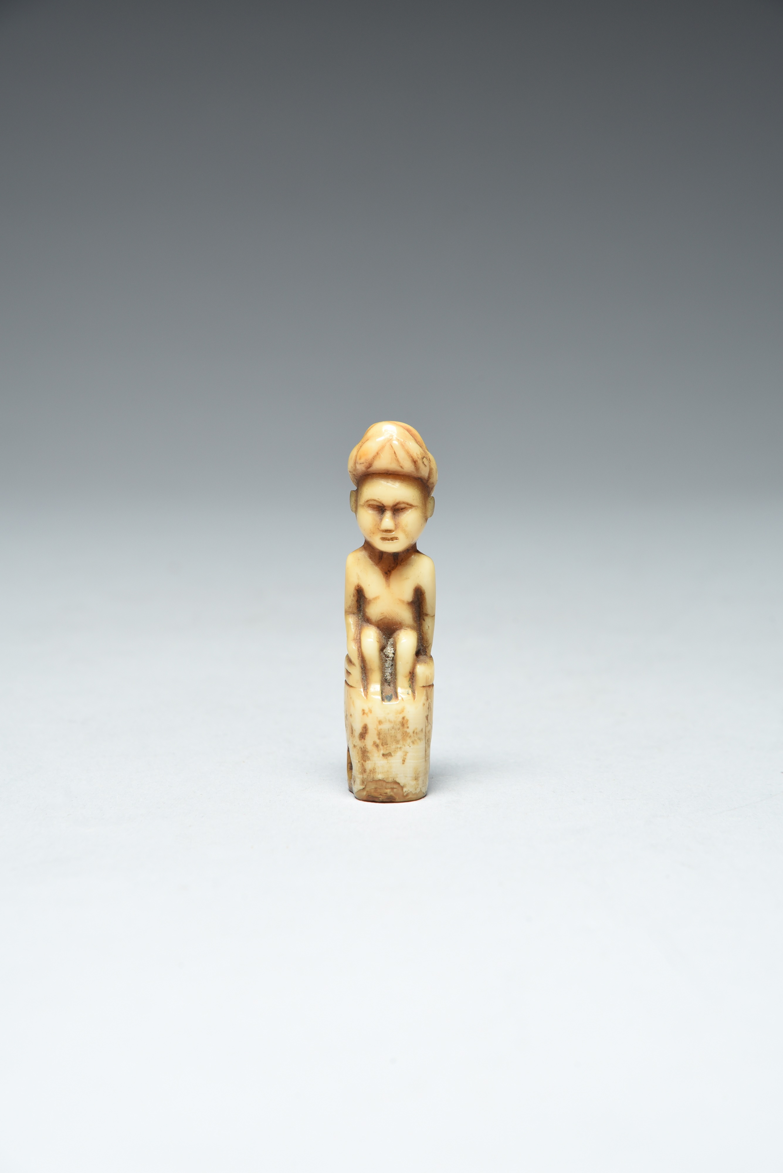 tooth, carved a seated figure wearing a headdress, the base pierced for attachment,