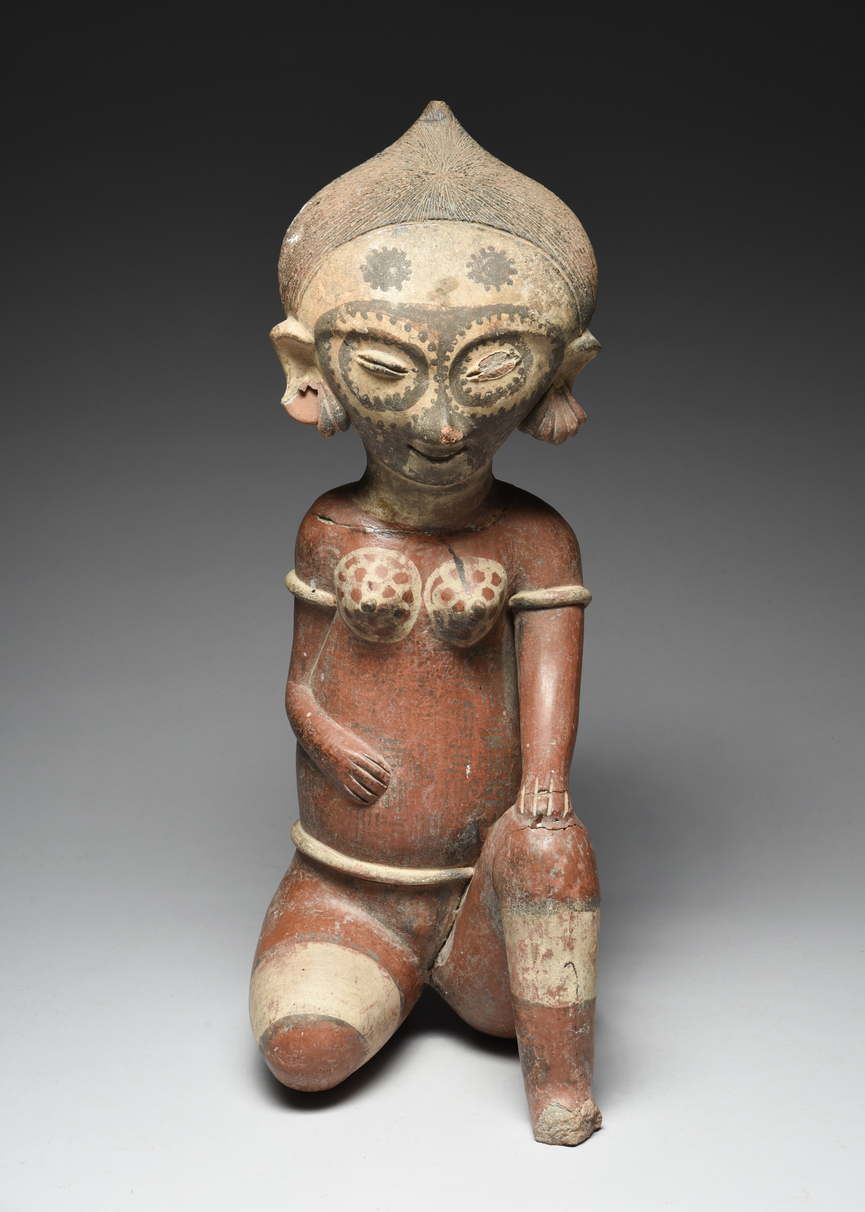 terracotta, with a pointed top finely incised linear coiffure, modelled wearing ear ornaments, armbands and a waist band, with a painted face, breasts and the body with a chequer linear textile design, and with banded legs,