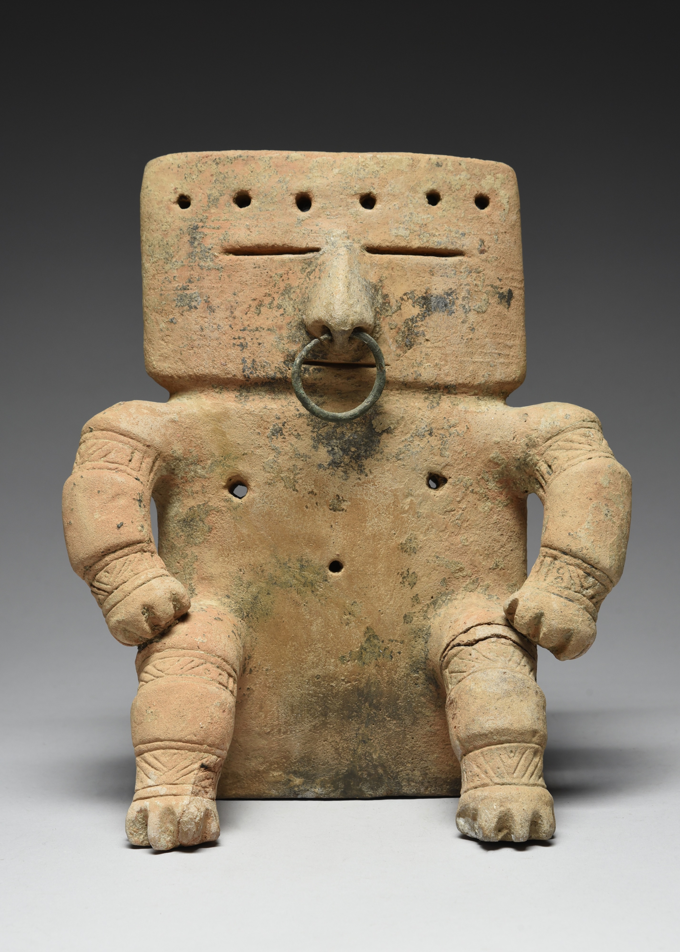 terracotta, pierced to the top of the head, forehead and body, with relief lines to the face and incised bands to the arms and legs, with a metal ring to the nose,