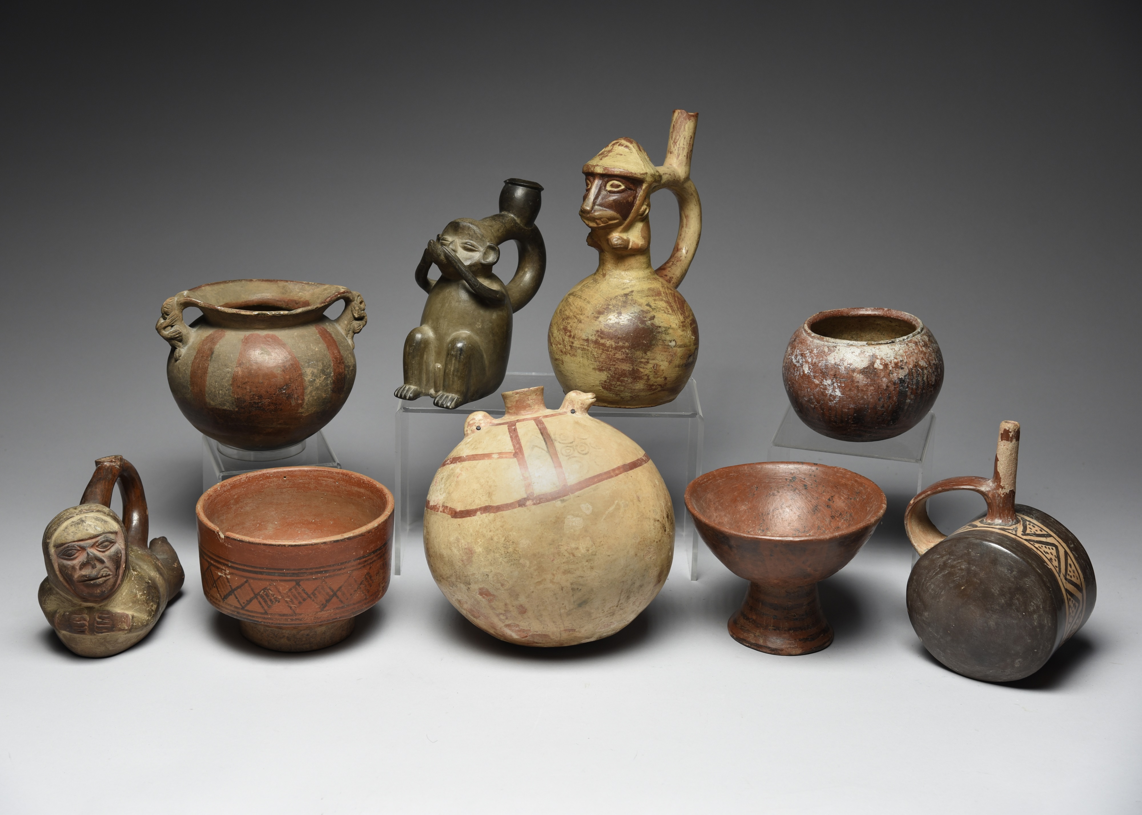 ceramic, including a Chavin seated monkey, 17cm high, a Chancay cylinder, 19cm high and two Moche figural, 13.5cm and 23cm high, a Peru pottery flask, 20.5cm high, and four Colombian pottery vessels. (9)