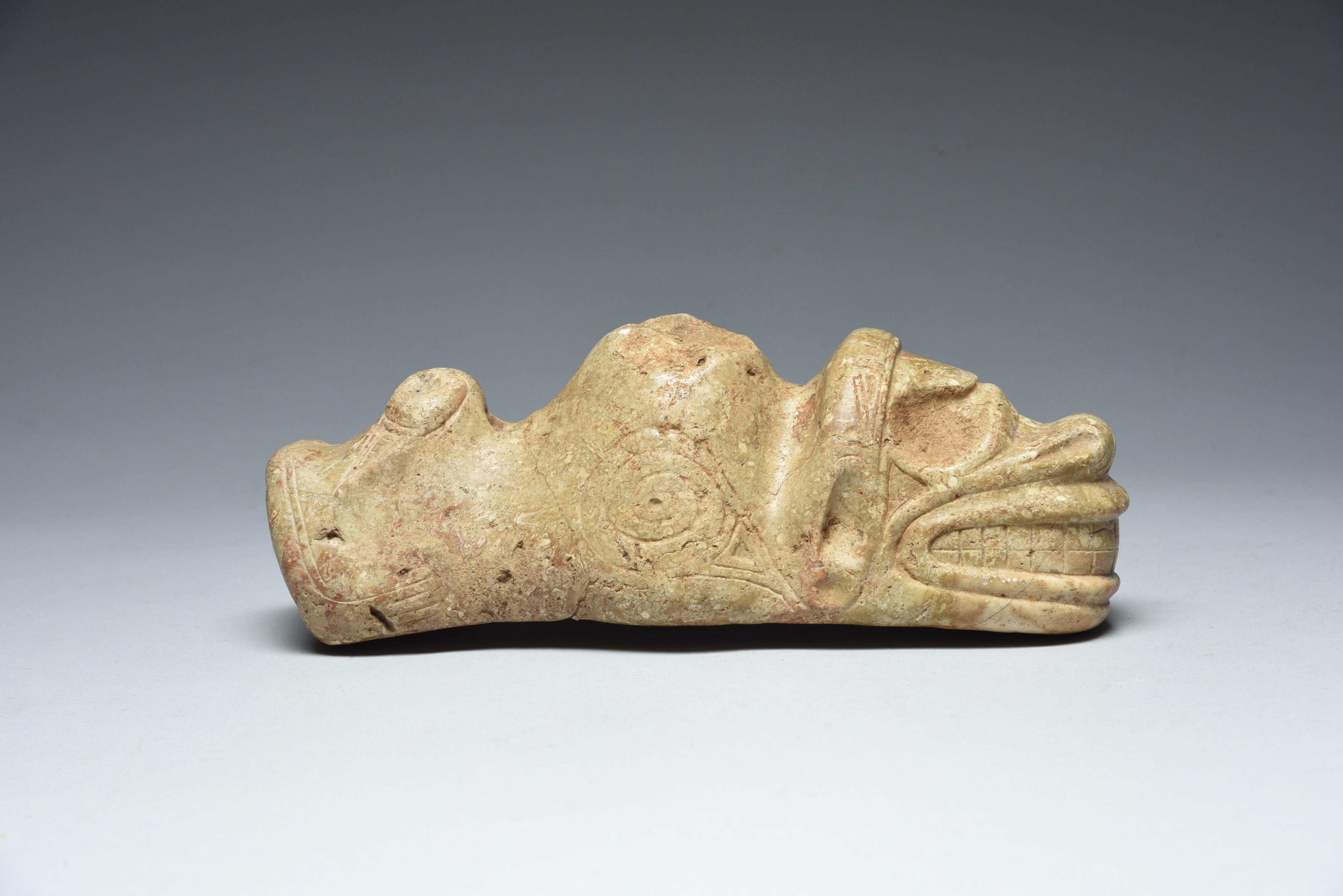 stone, with a carved zemi head to the front with deep recessed eyes and a wide open mouth with teeth, the centre point missing and with incised spiral decoration, the back with incised legs, with a concave underside,
