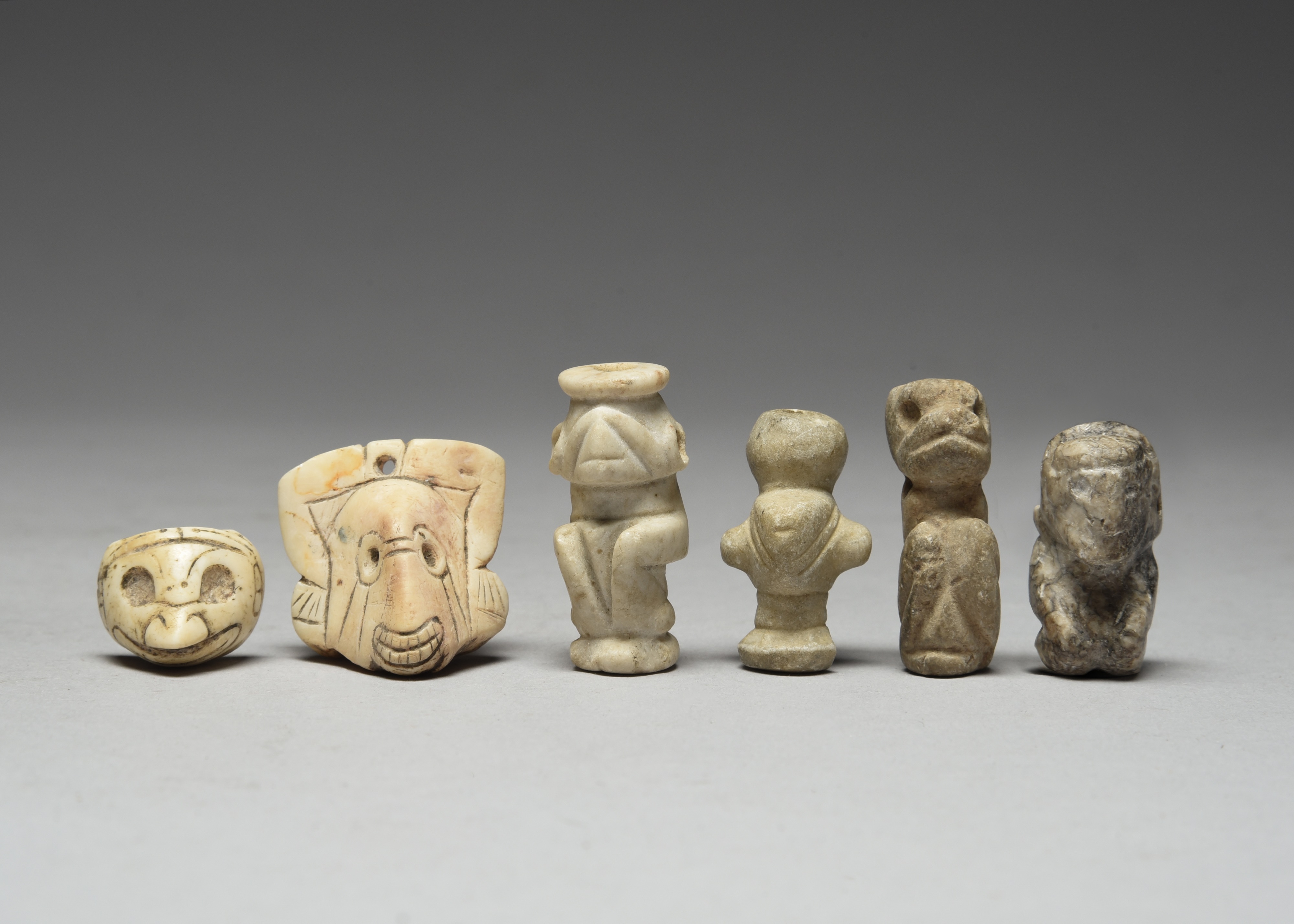 stone, two as crouching figures, 3.9cm and 3.2cm high, a bust 3.4cm and a crouching animal, with collection number 605, 3.7cm high, all drilled for attachment and two Taino shell mask amulets, Dominican Republic, circa 1000 - 1500 AD, 3.3cm and 1.8cm high. (6)