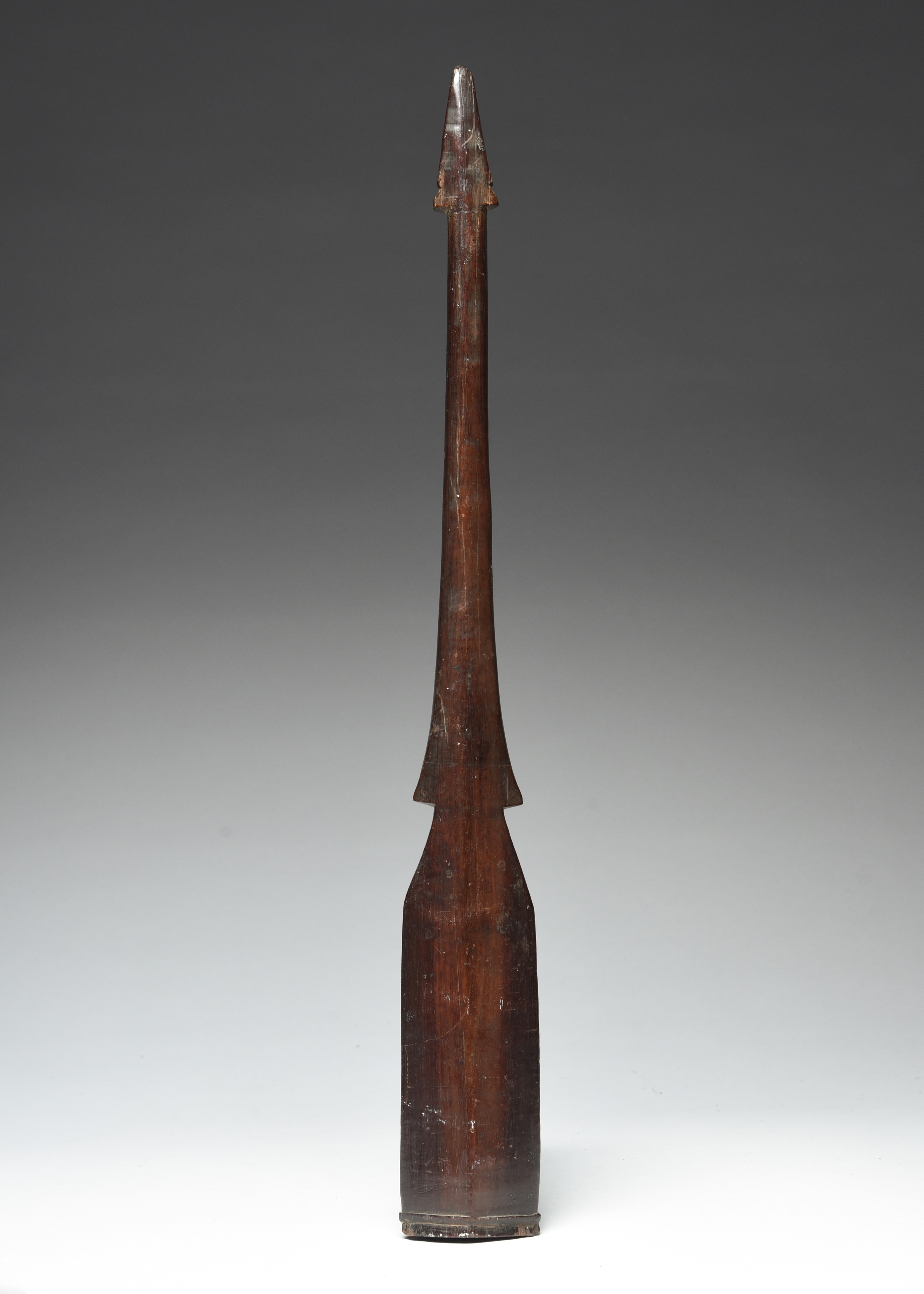 having a shouldered diamond shape top with a banded edge, on a tapered handle with a pointed terminal,