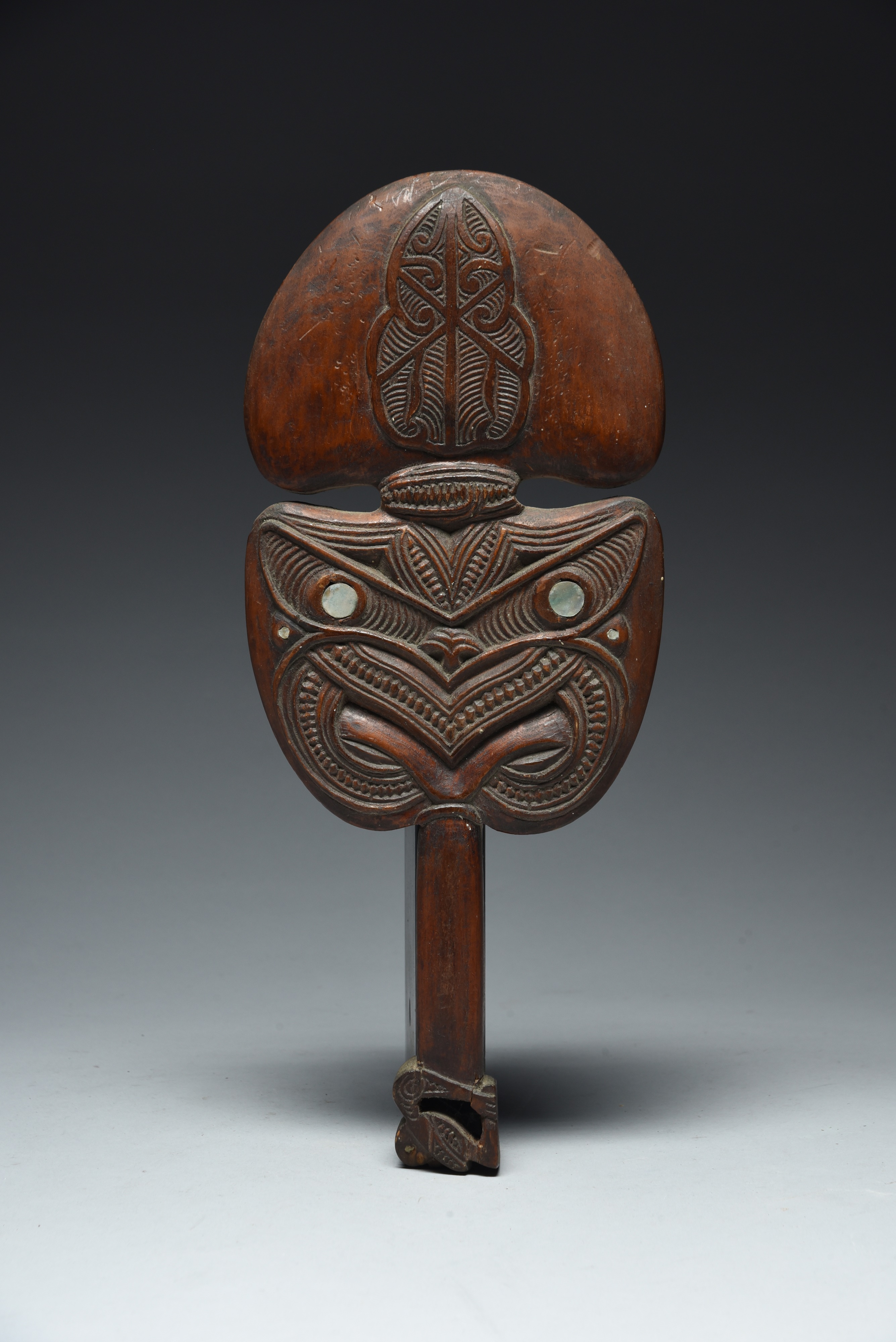 carved a tiki head either side and a tiki terminal to the handle, with haliotis shell,