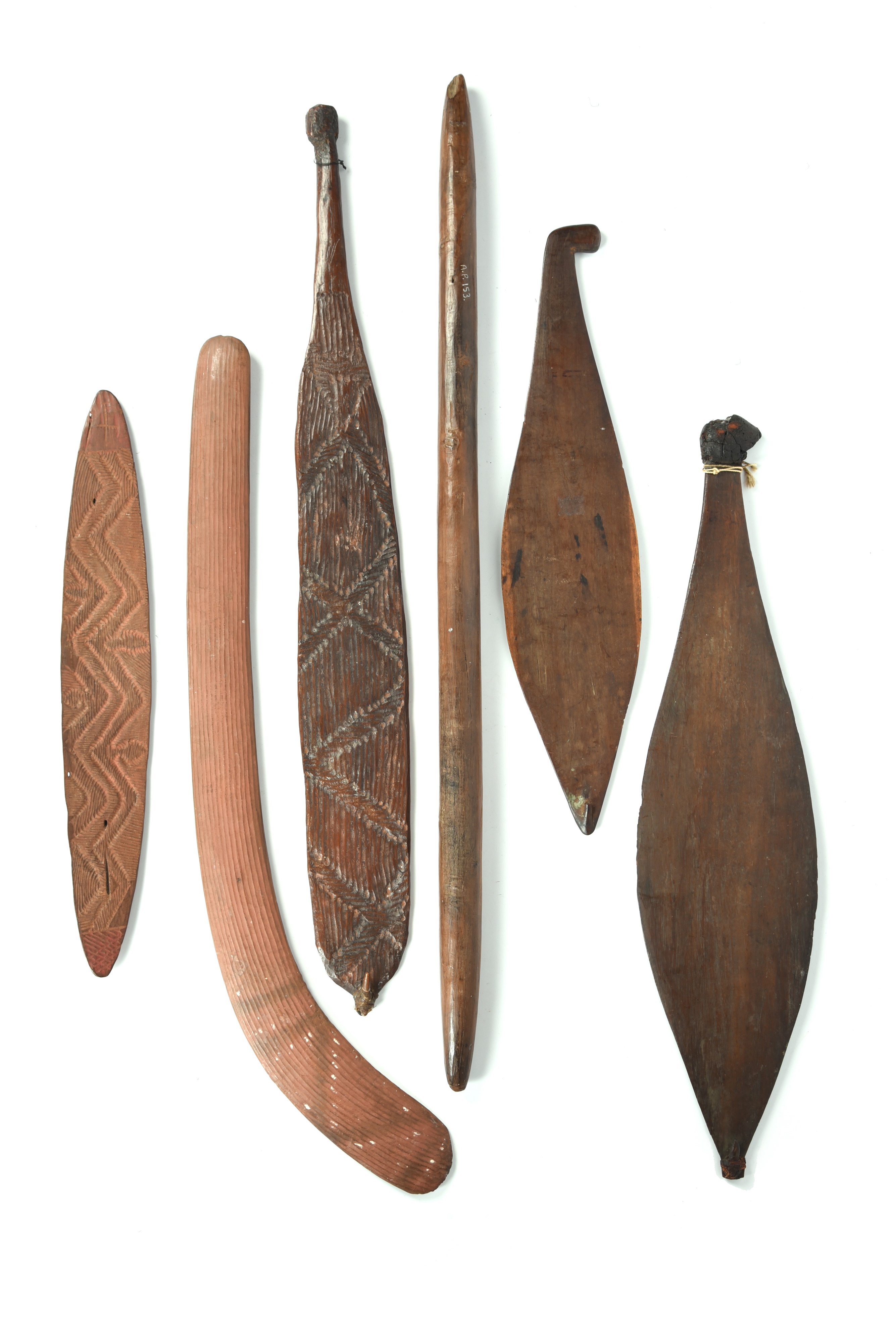 an Aboriginal churinga, the back carved fauna and a head outline wearing a hat, with natural pigment, 46.5cm long, three spear throwers woomera, 73cm, 60cm and 49.5cm long, and a digging stick, with inscibed collection number A.P.153., 81.5cm long. (6)
