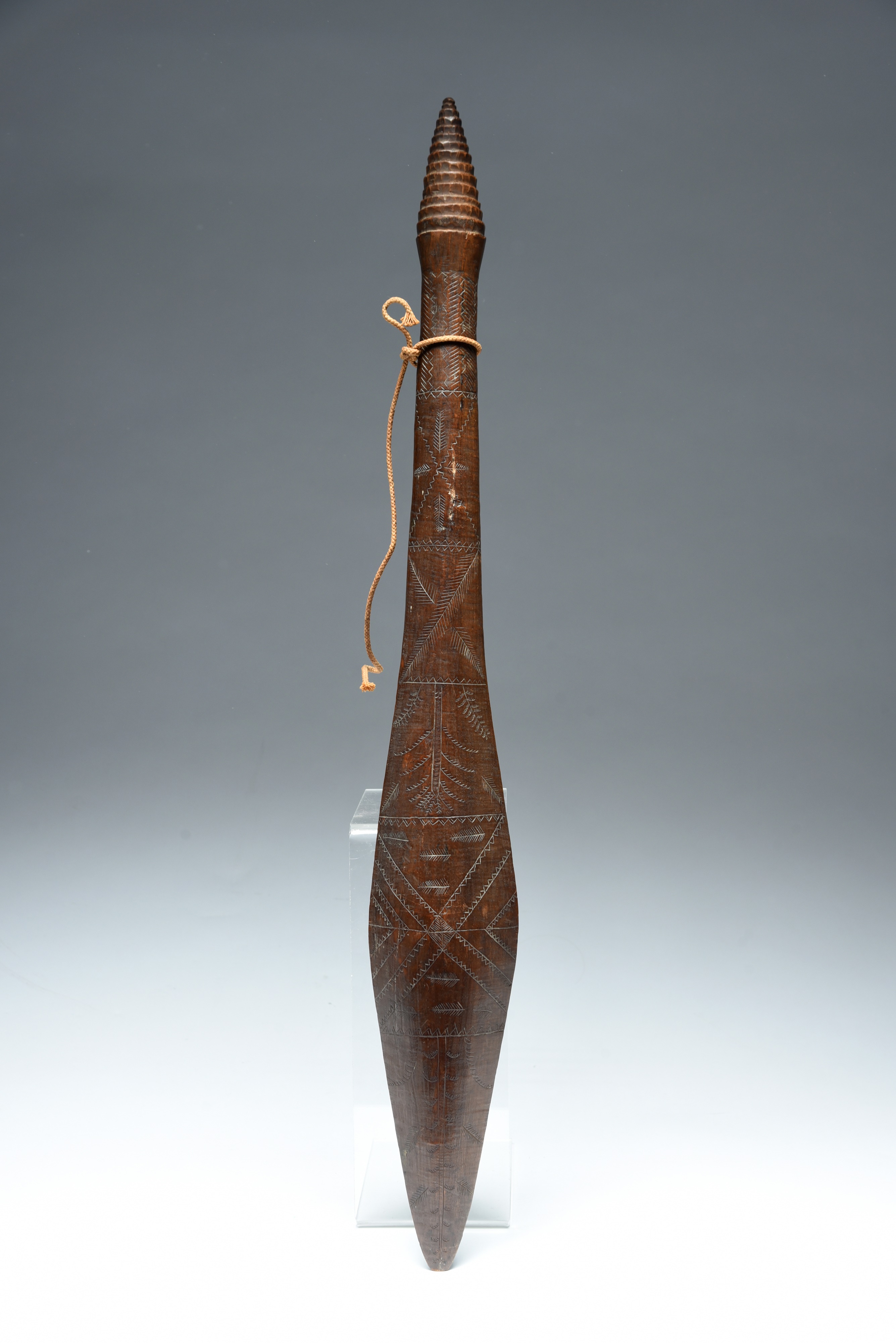 of swollen form with a pointed end and stepped terminal, with incised decoration depicting trees and birds,