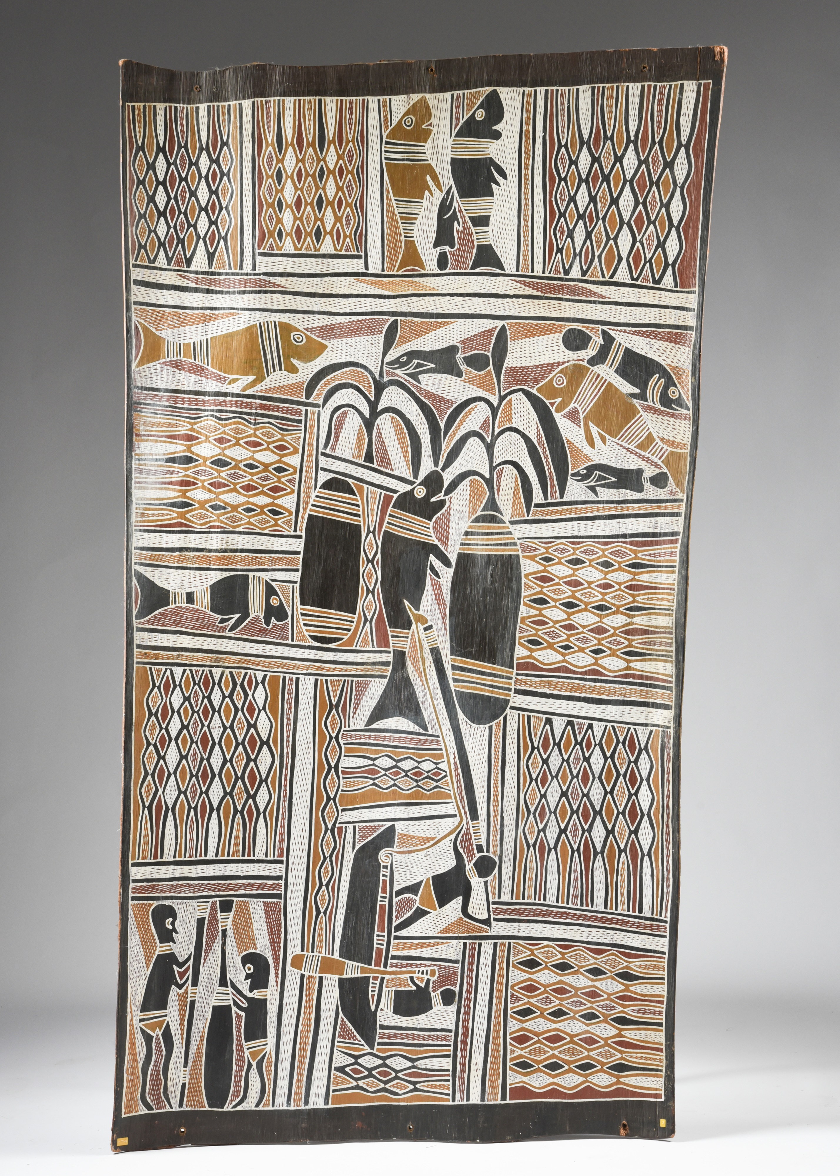 Dreamtime - depicting the fishermen, Borag and Wugarmadji, with paddle and harpoon, and in their canoe spearing a dugong; the canoe then turns into a rock and the dugong feeds off seaweed and other fish swim nearby,