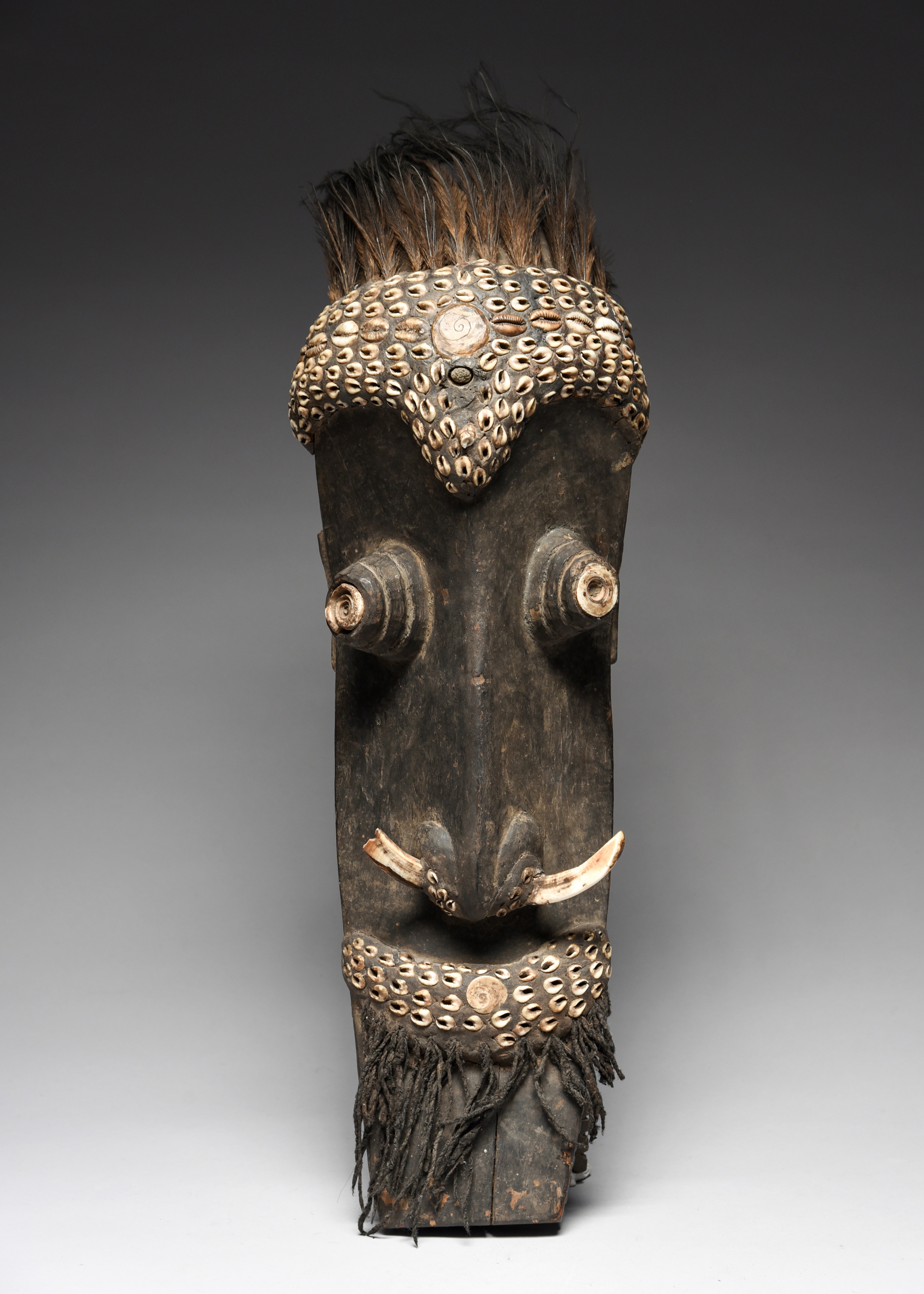 with applied clay, shells, fibre, cassowary feathers and tusks,