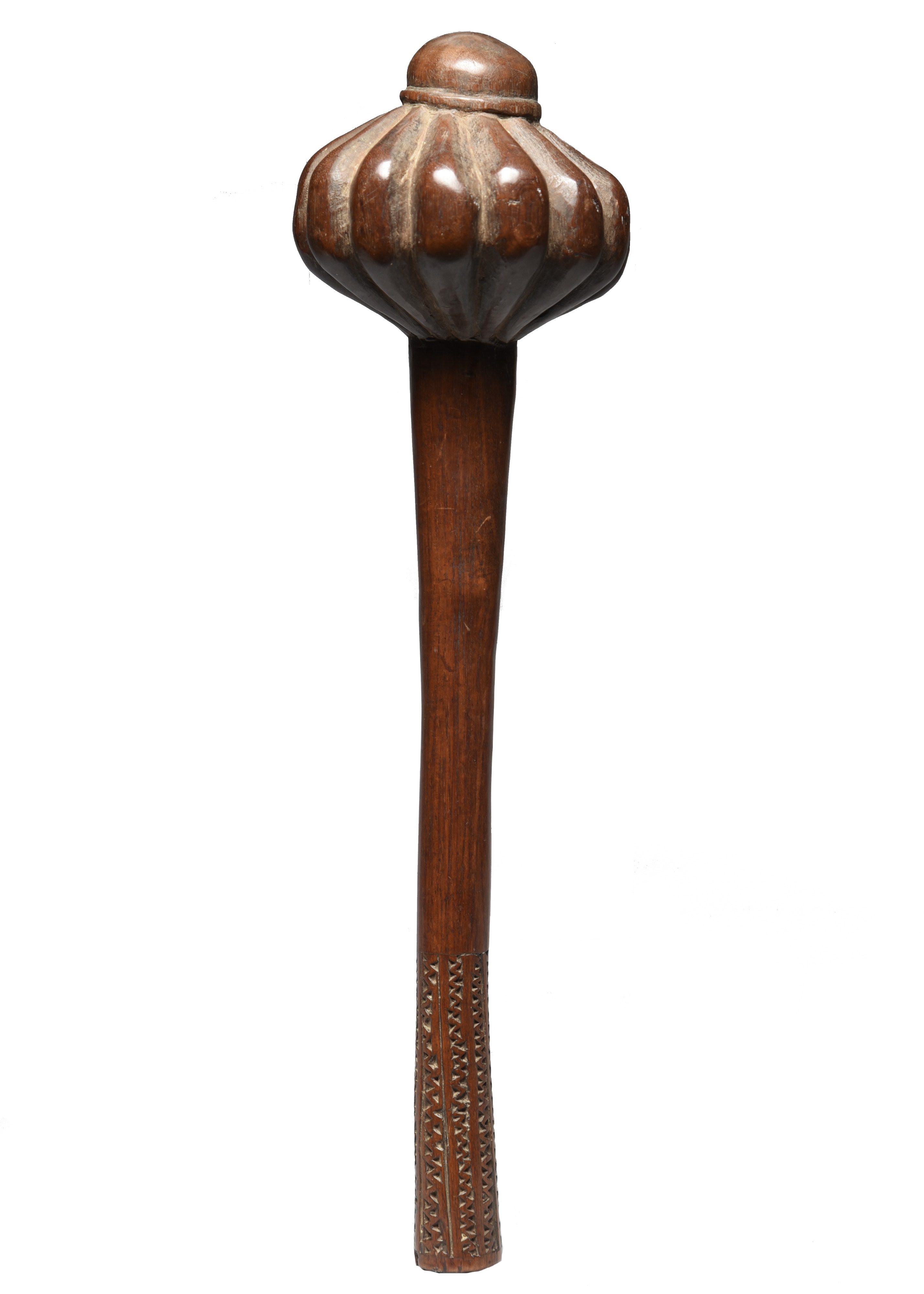 with a ribbed head and domed finial, with a carved zig-zag grip,