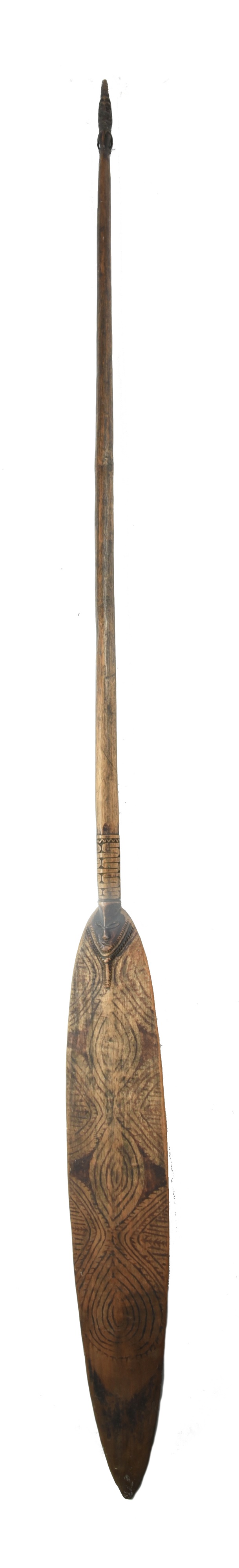 the blade with painted decoration and a carved mask, a part medial ridge to the back and carved bands above, the tapered shaft with a carved ancestor figure terminal,