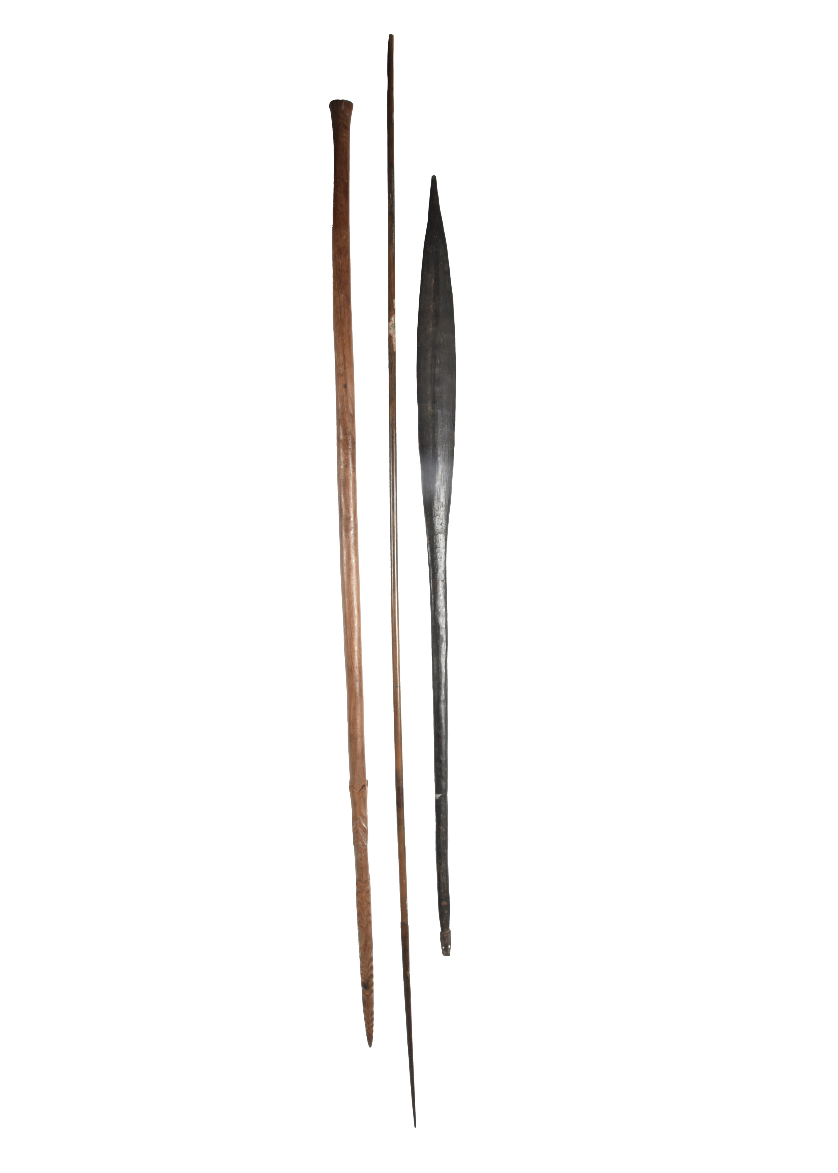 an Oceanic barbed spear, 181cm long and a Papua New Guinea palmwood paddle/spear, with two attachment holes to the end, 148cm long. (3)