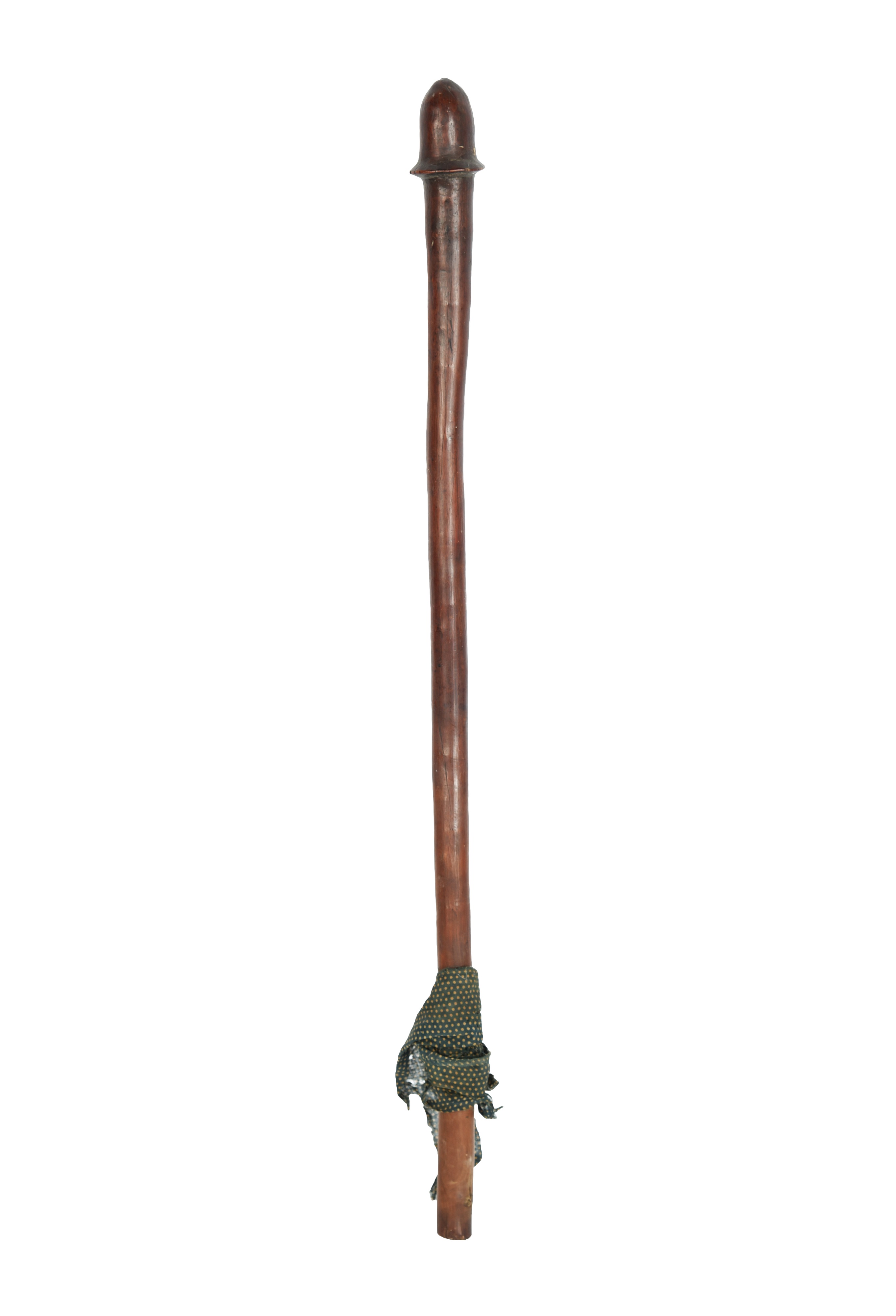 with a phallic head and faint incised chevron bands below, with a strip of cotton tied to the handle,