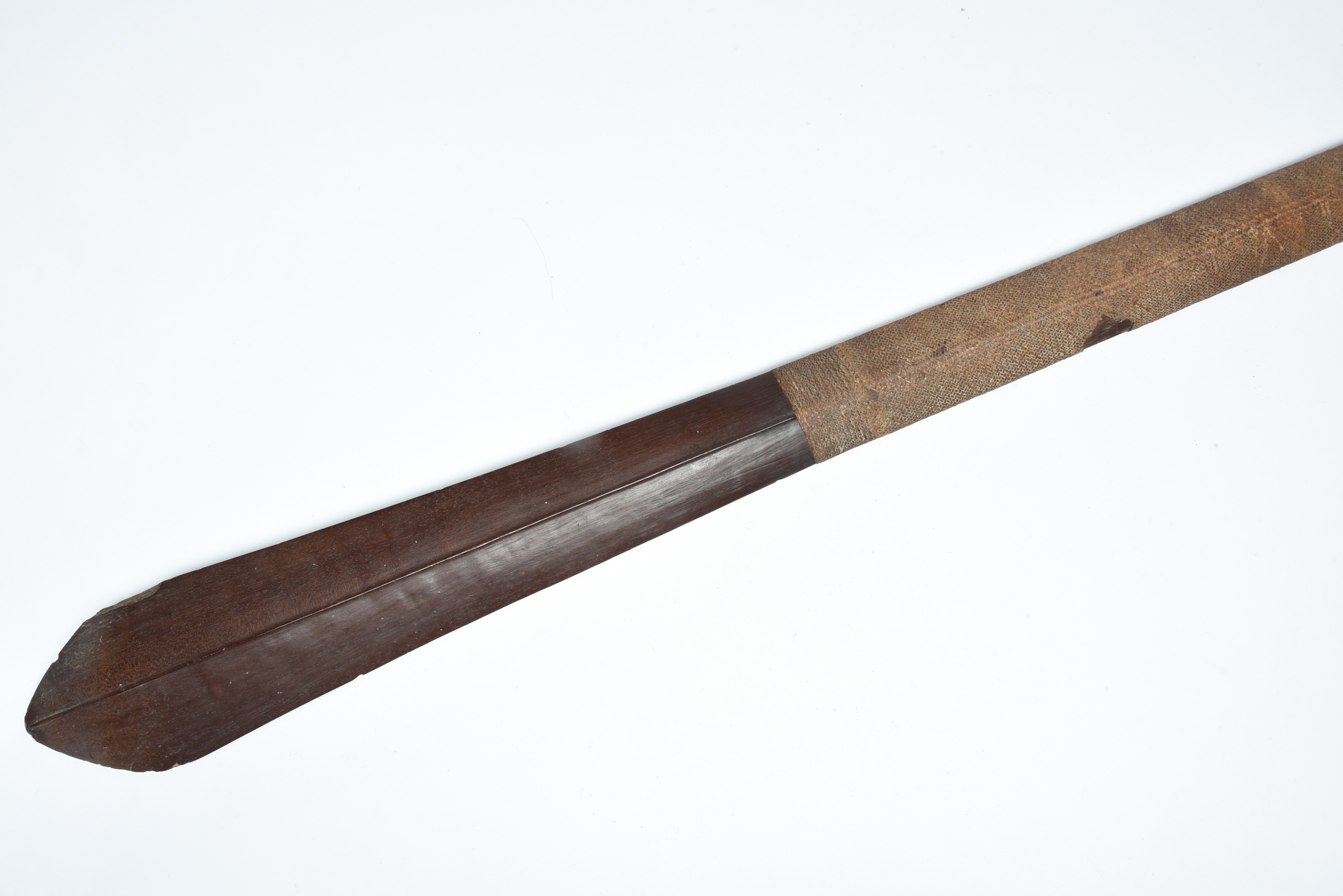 of spatulate form with a medial ridge to the blade, the shaft part bound with woven palm leaf, the end with a hole for attachment,