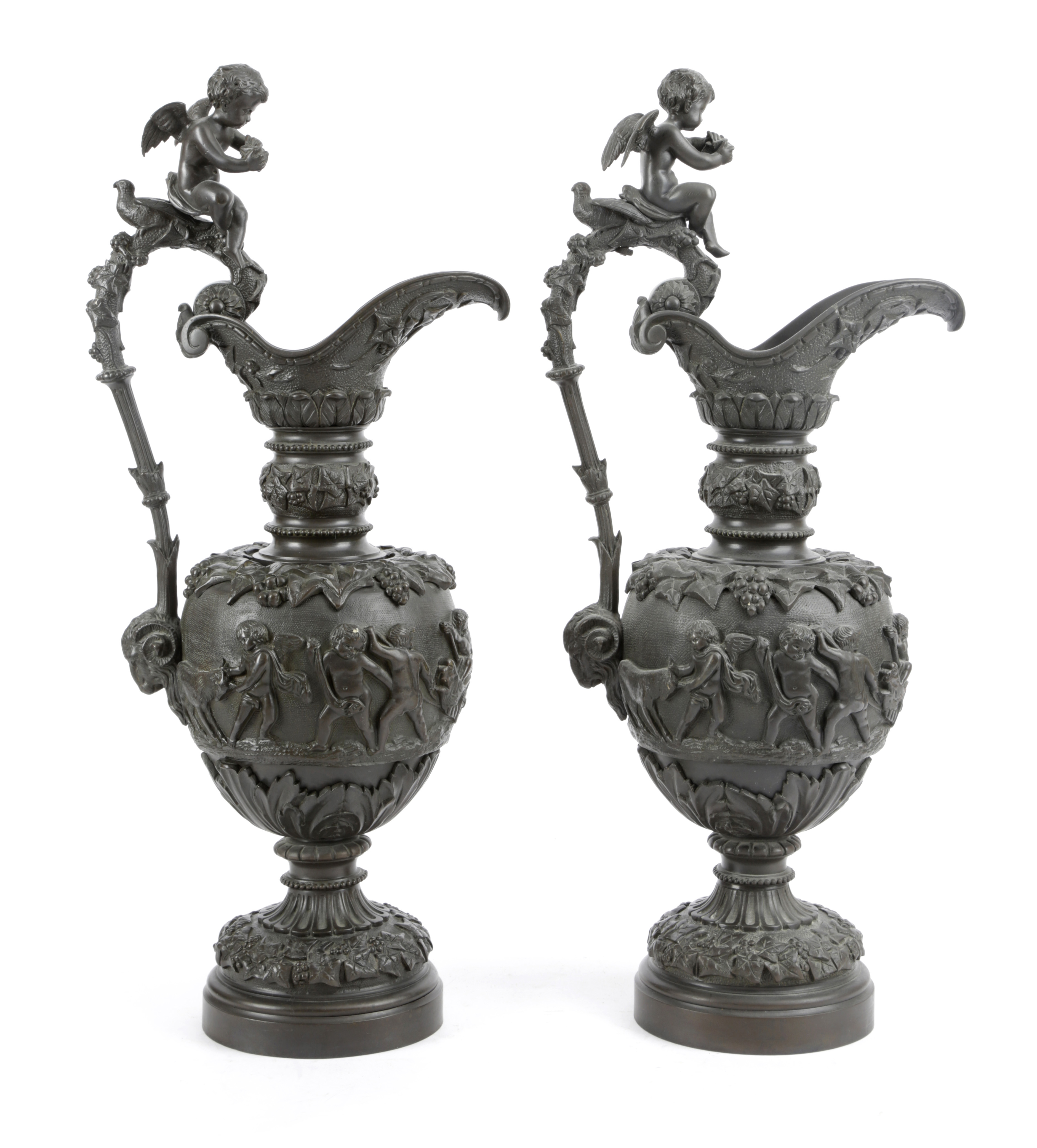 A LARGE PAIR OF BRONZE ORNAMENTAL EWERS IN RENAISSANCE STYLE
