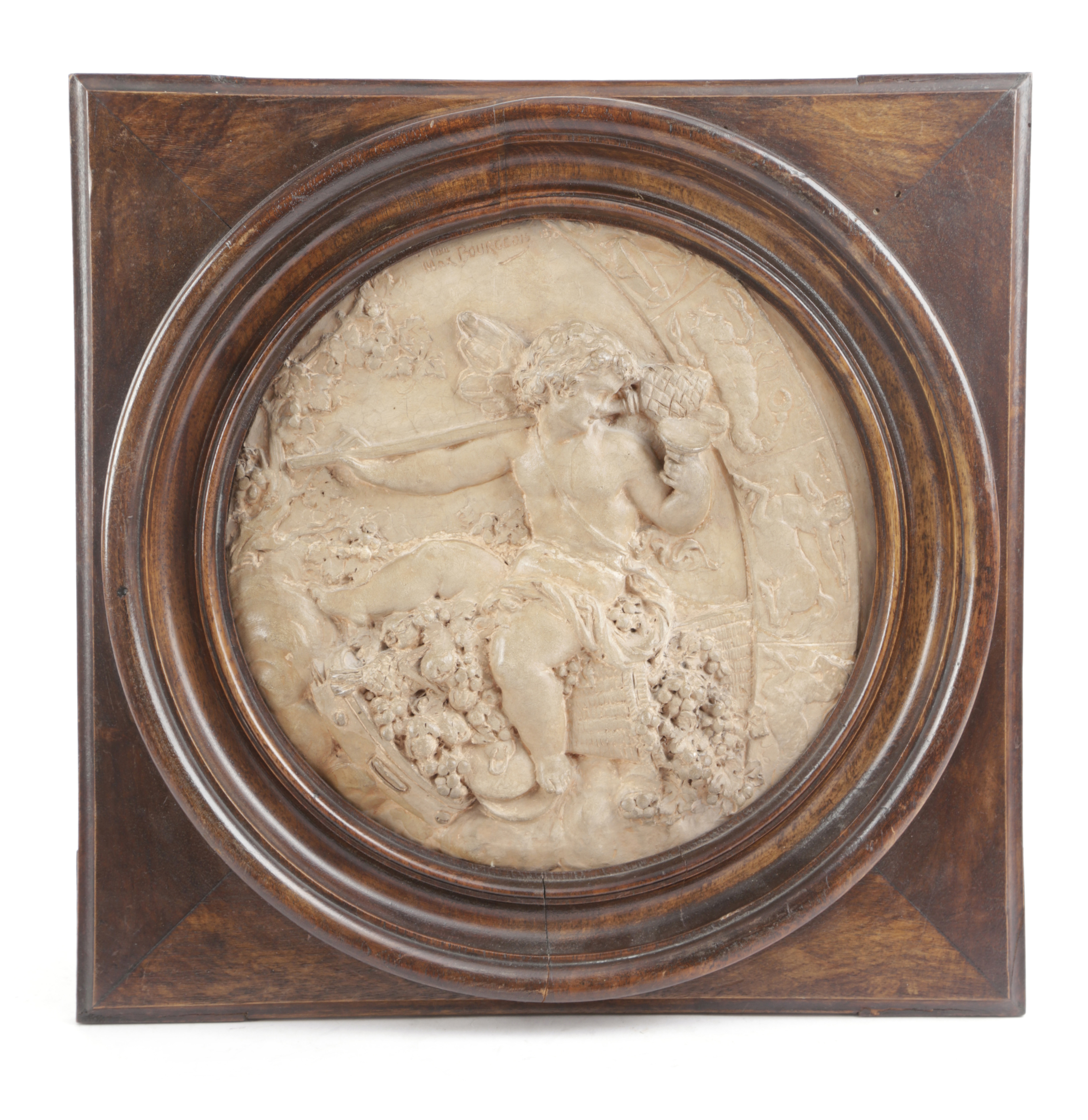 each relief moulded depicting a cherub with seasonal plants, symbols and star signs, inscribed 'MAX BOURGEOIS', in walnut frames (4)
