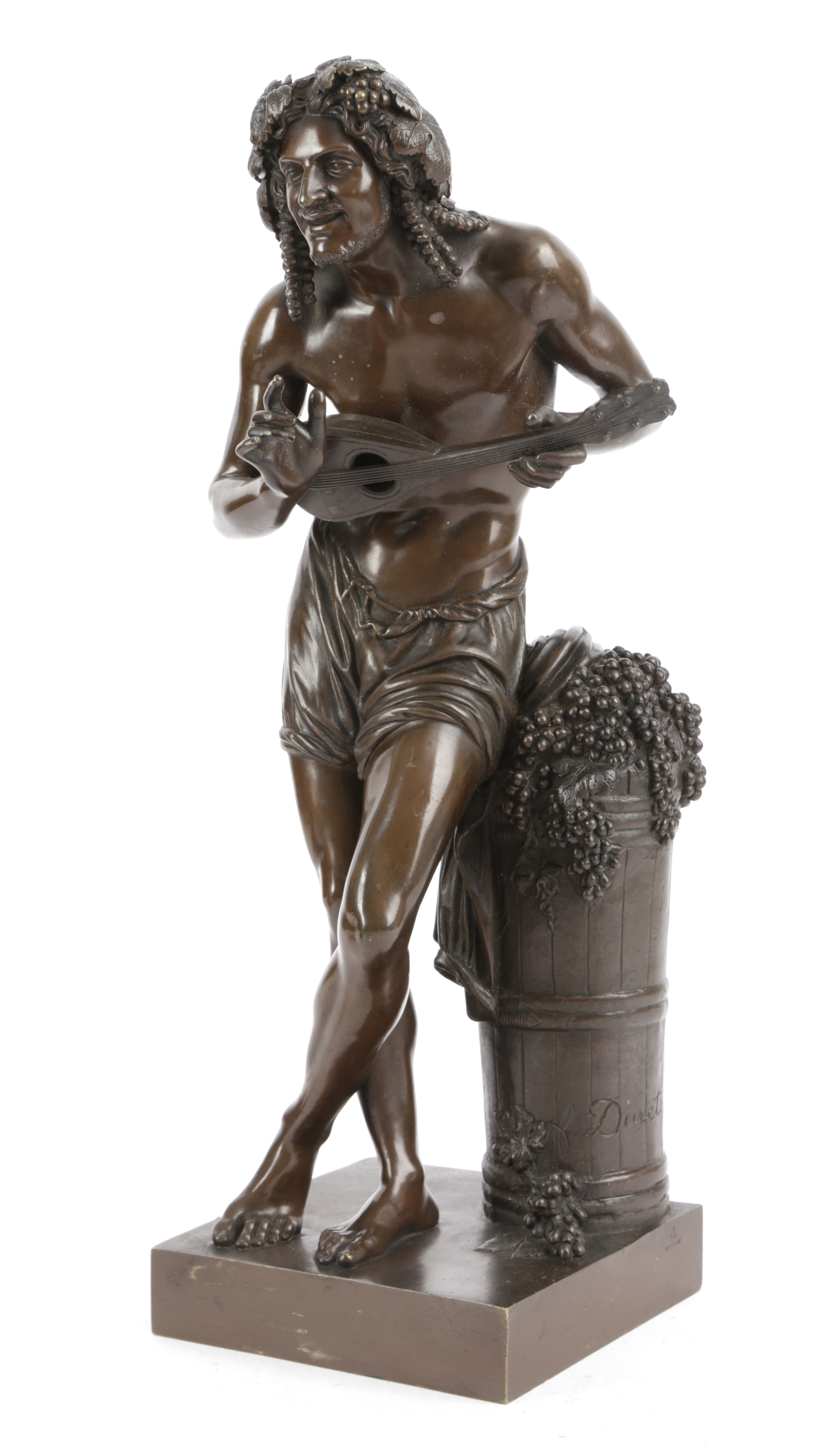 the Bacchic musician depicted standing beside a barrel of grapes and playing a mandolin, signed 'F. Duret' and with foundry stamp 'A D Delafontaine'