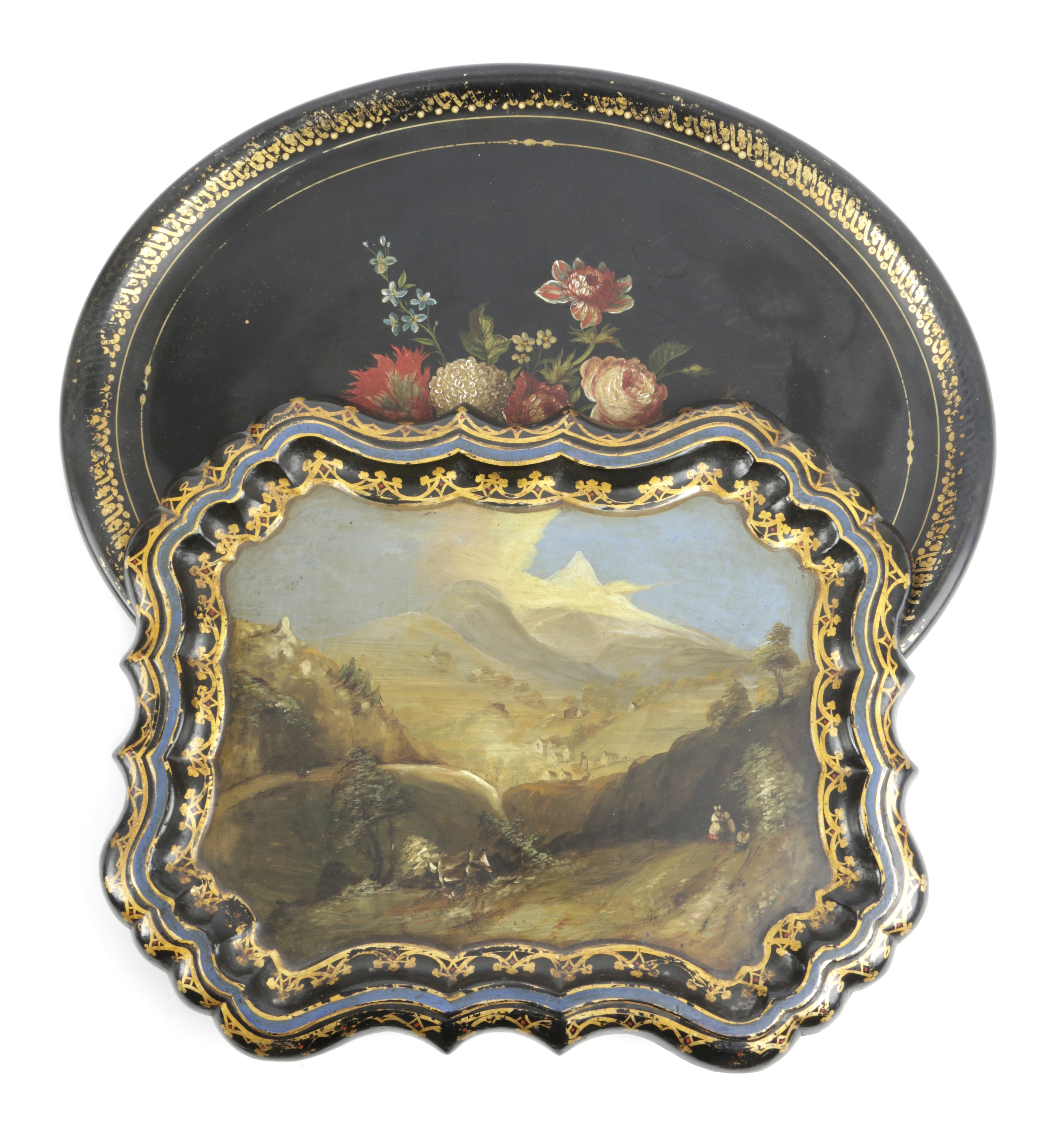 of cartouche form, painted with a mountainous landscape view inside a gilt and painted border, together with an oval tray painted with flowers (2)