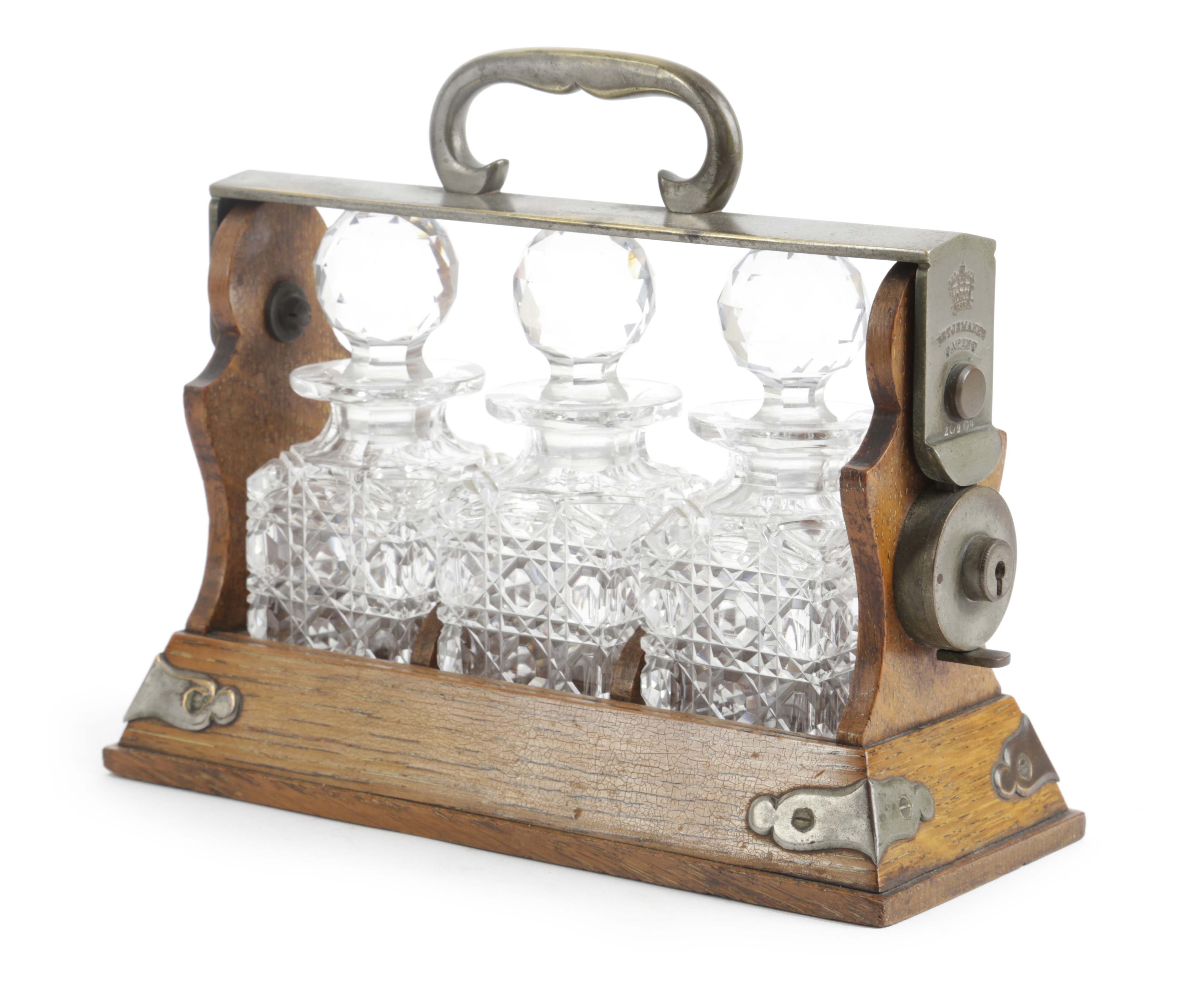 AN OAK AND SILVER PLATED SCENT BOTTLE TANTALUS