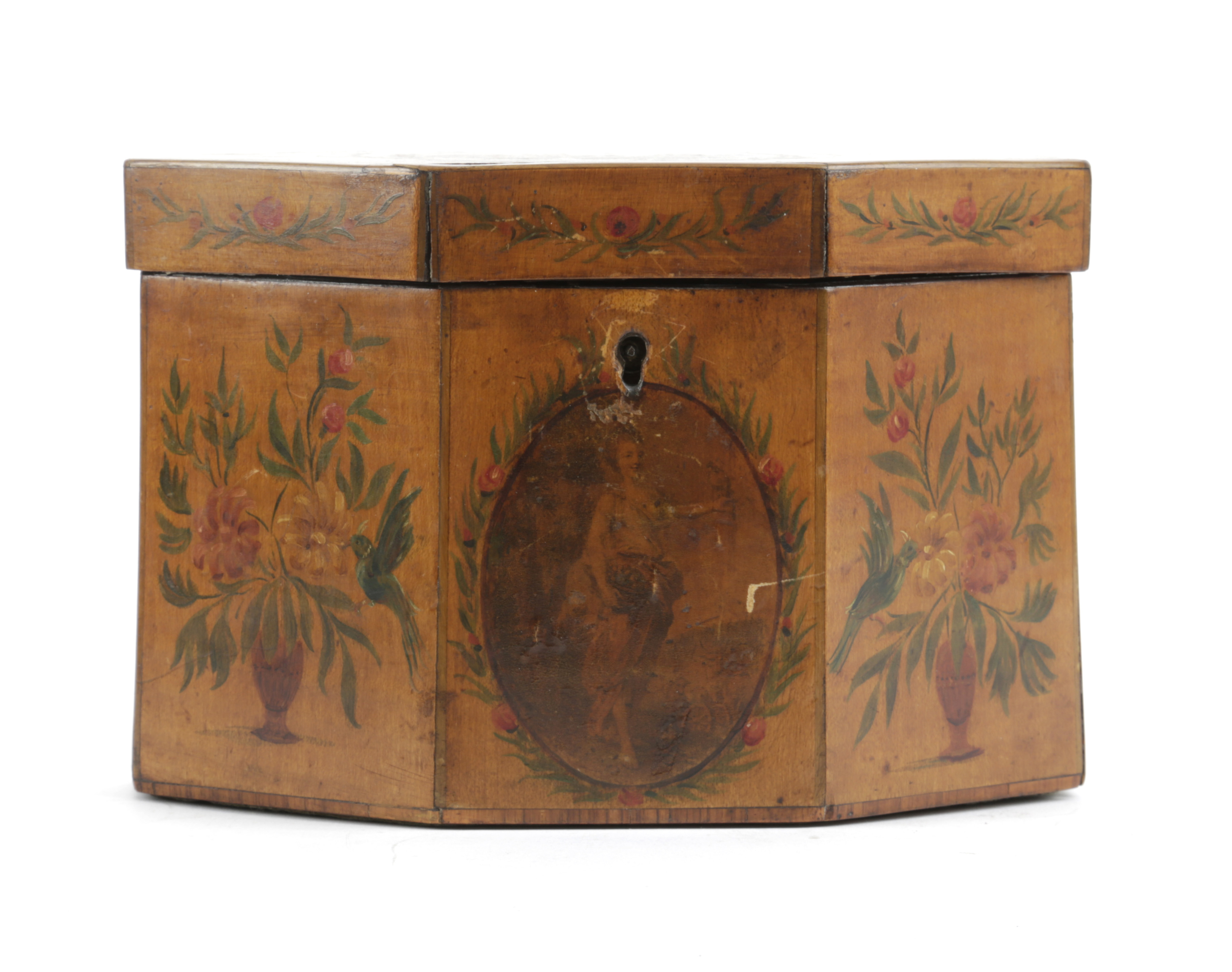 A GEORGE III SATINWOOD OCTAGONAL TEA CADDY