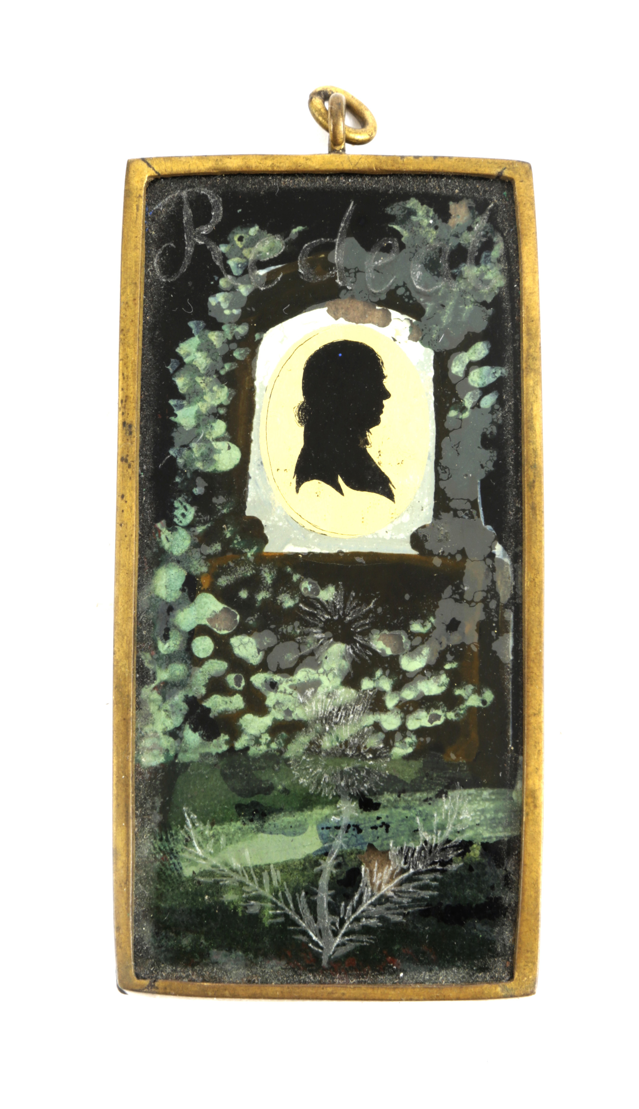 of rectangular form, with a profile silhouette probably of Bonnie Prince Charlie on an oval gilt ground and surrounded by reverse painted foliage, the glass engraved 'Redeat', a sun and a thistle, in a brass frame