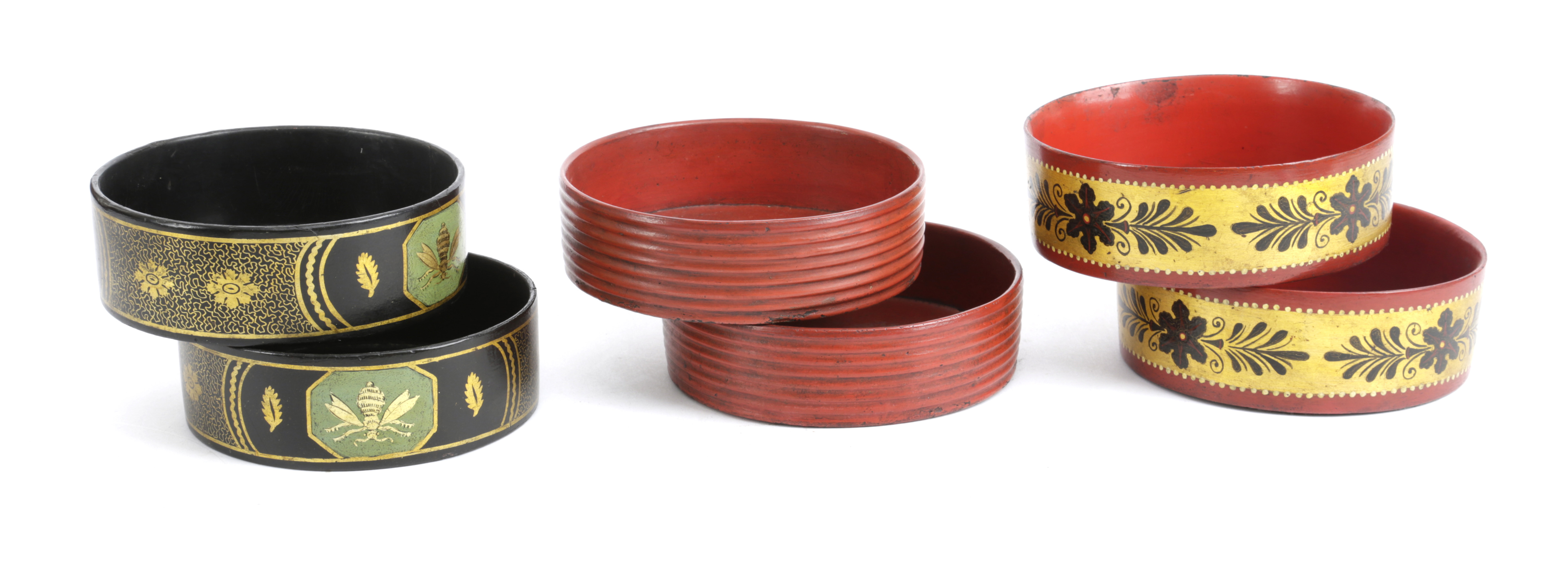 THREE PAIRS OF REGENCY PAPIER-MACHE WINE COASTERS