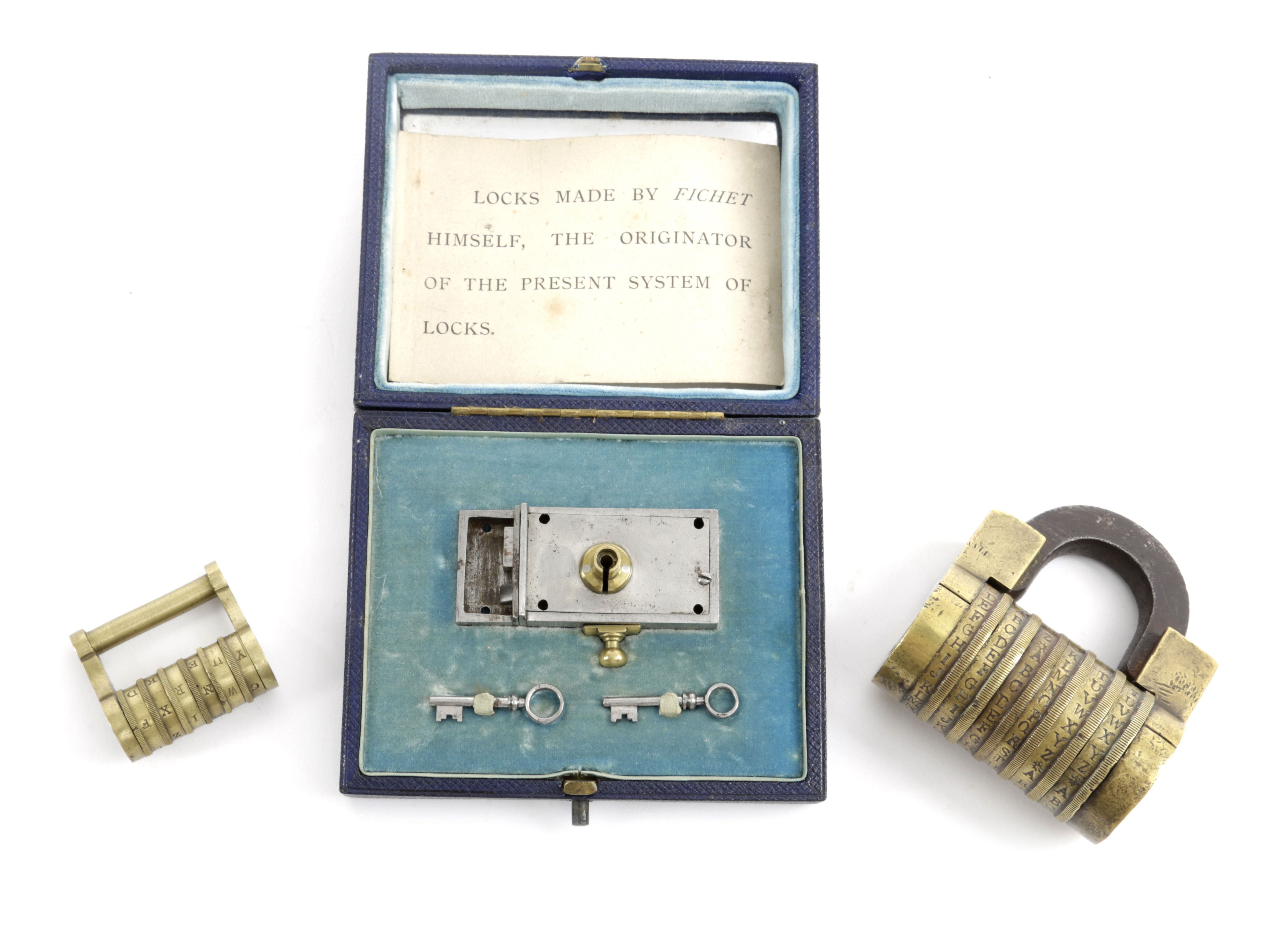 in a fitted case, with a label inscribed 'Locks made by Fichet himself, the originator of the present system of locks', together with two Victorian brass and steel combination locks, each with six barrels (3)