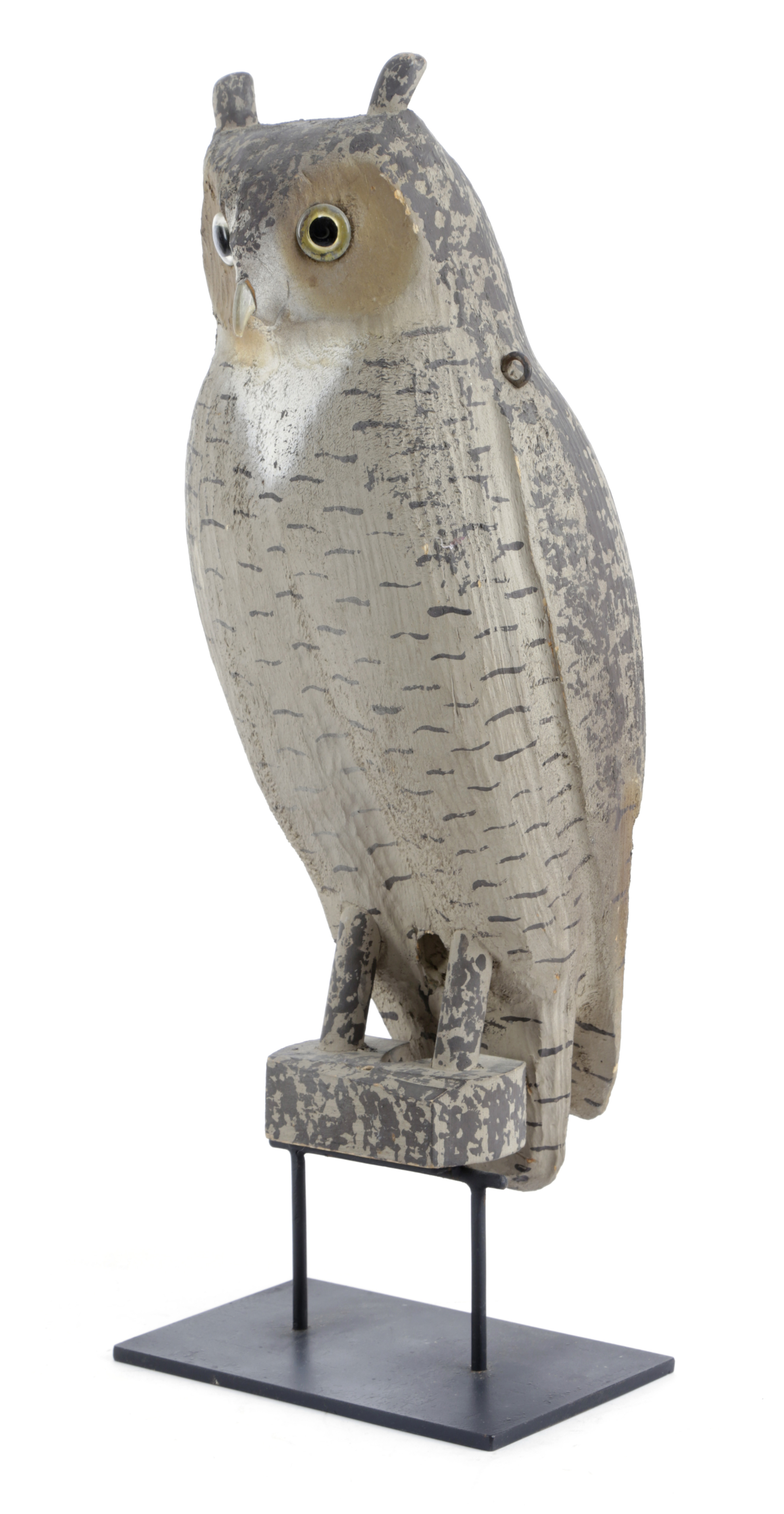 AN AMERICAN CARVED WOOD GREAT HORNED OWL DECOY