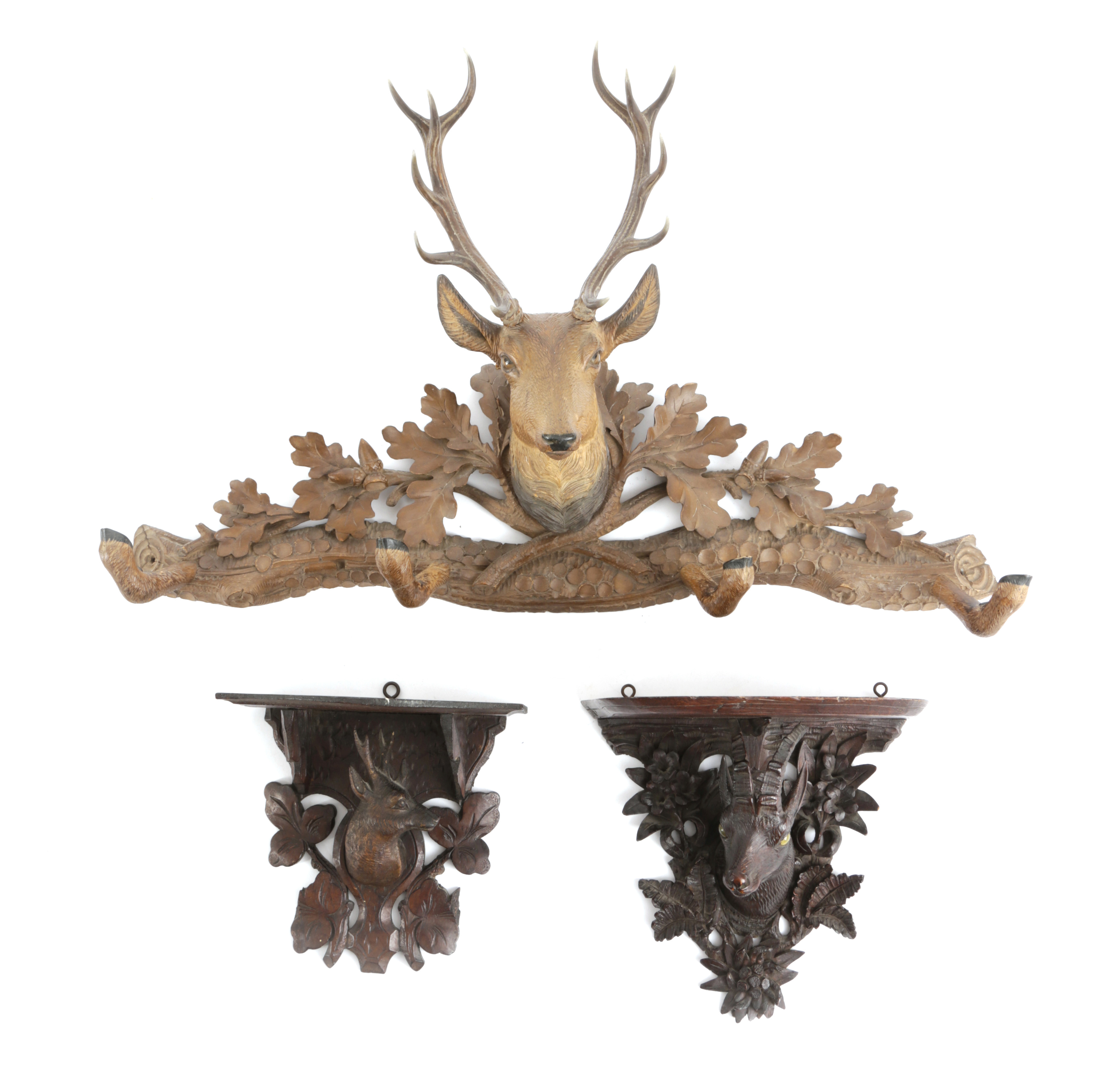with a central deer's head amongst oak leaves and with four hoof hooks, inscribed '2 nbre 1910 Geneveive Suisse', together with two Black Forest wall brackets with a deer and a goat's head (3)