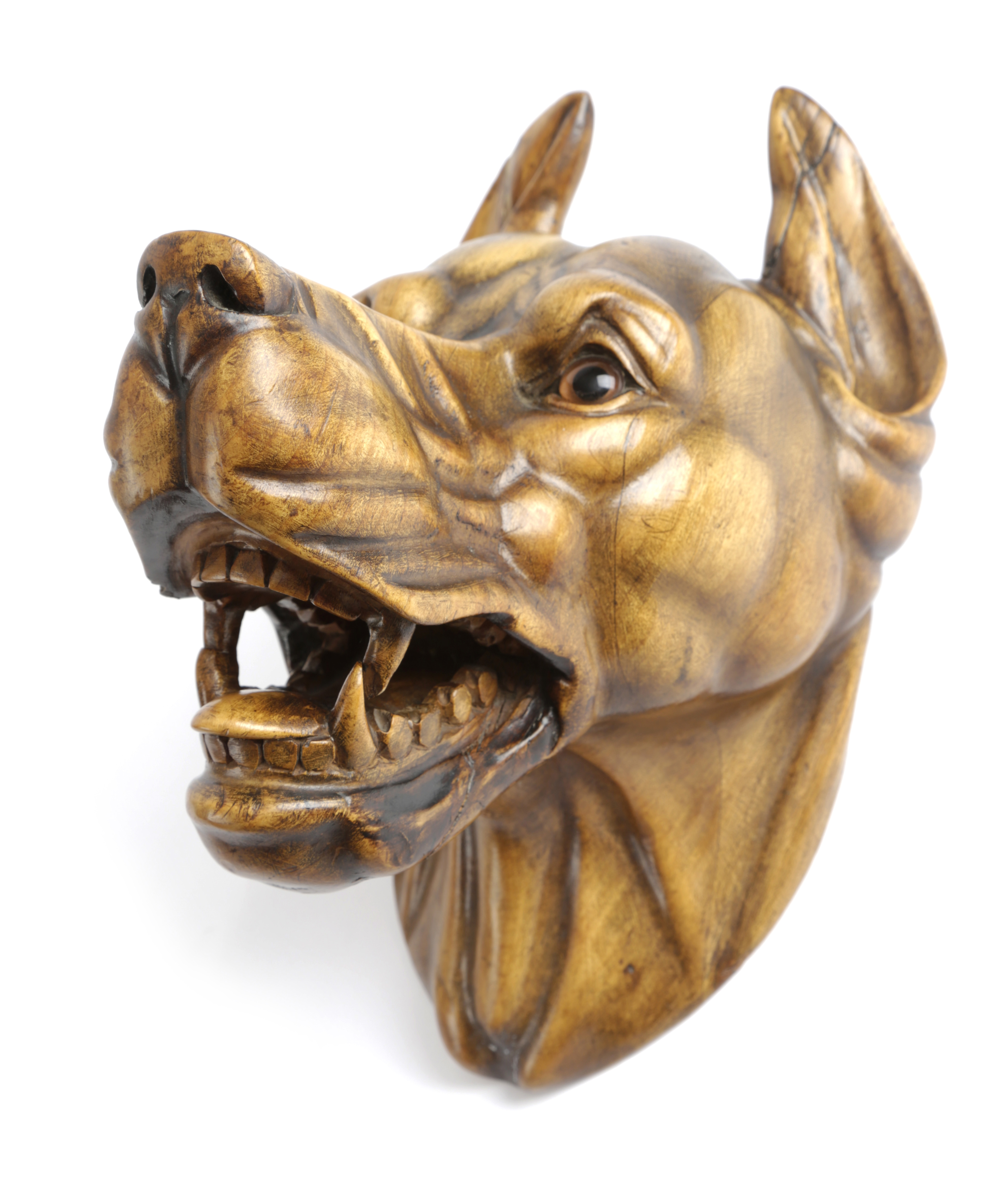 A BLACK FOREST LINDEN WOOD HEAD OF A DOG