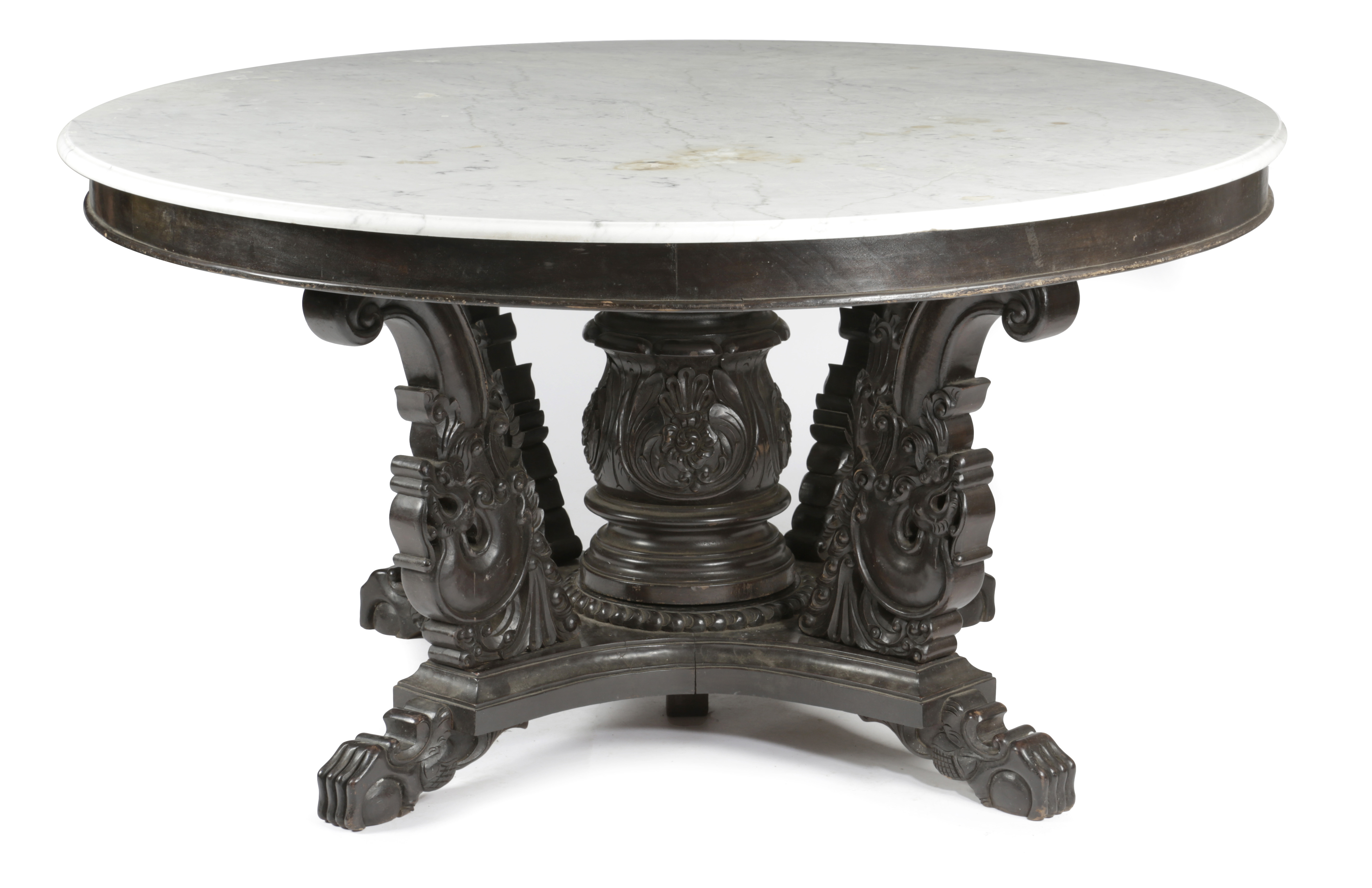 the circular white marble top with a moulded edge on a carved central stem and four supports