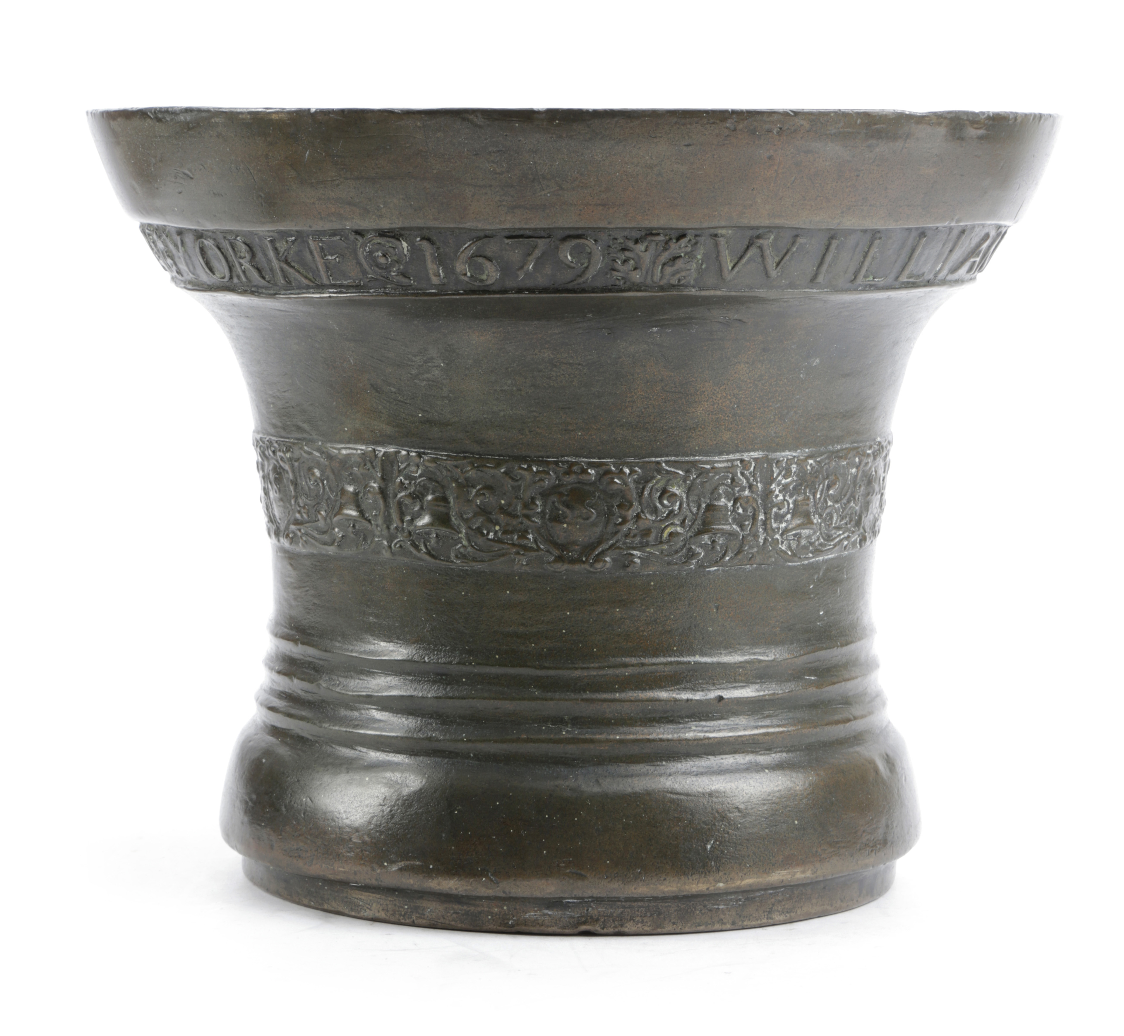 below the rim inscribed ‘WILLIAM METCALFE MERCER IN YORK 1679’, the waist cast with a wide band of bells, foliage and cartouches with maker's mark 'SS Ebor' (Ebor: Eboracencis, Latin for York)