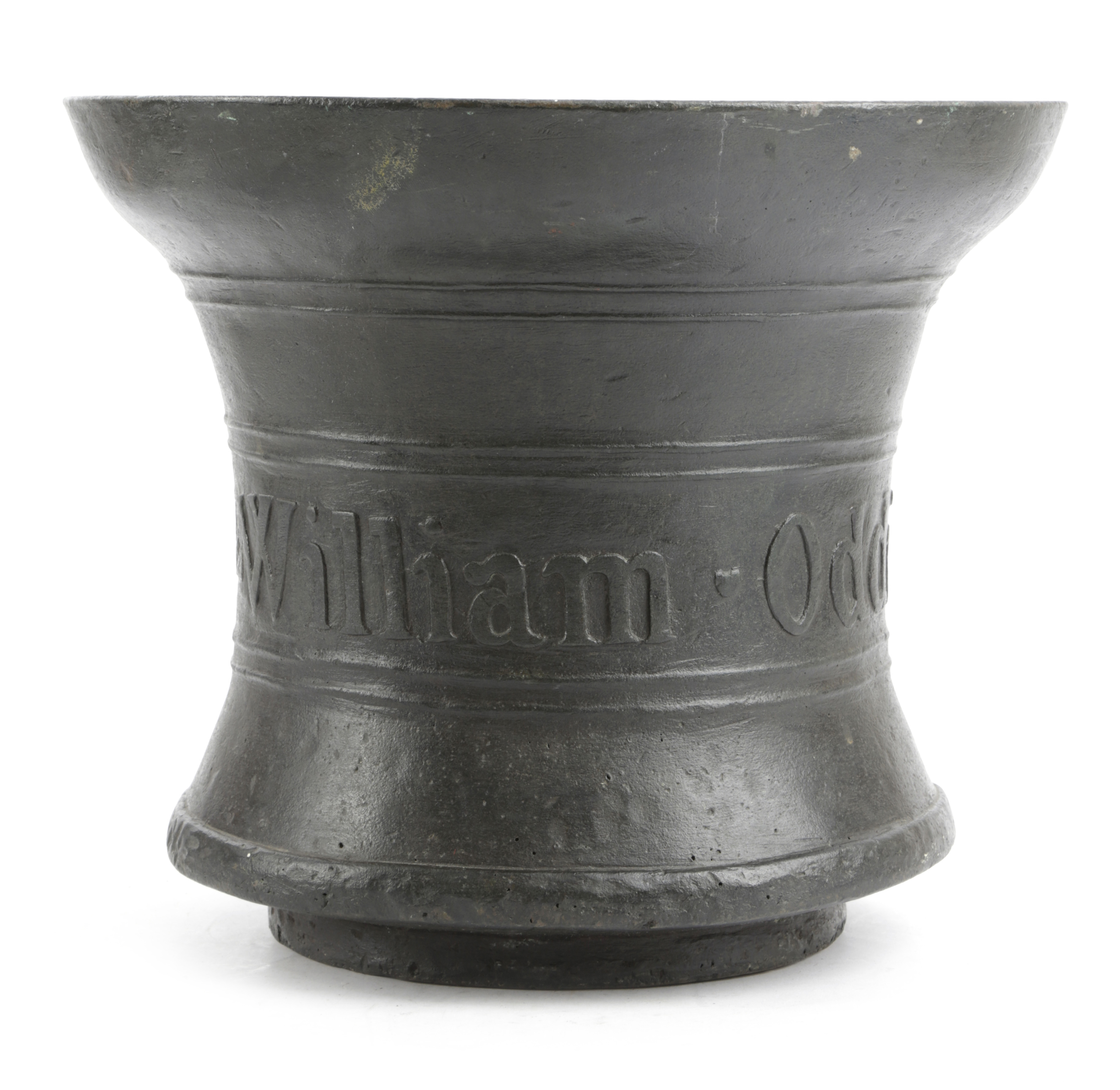 A William Oddie apothecary, died in Clitheroe, Lancashire in 1764. This mortar has several common features, including the small heart motif, thin cords and style of the numerals, comparable to mortars made by Ralph Ashton (fl.1703-1728). See M. Finlay, English Decorated bronze Mortars & their Makers', p. 55-57.