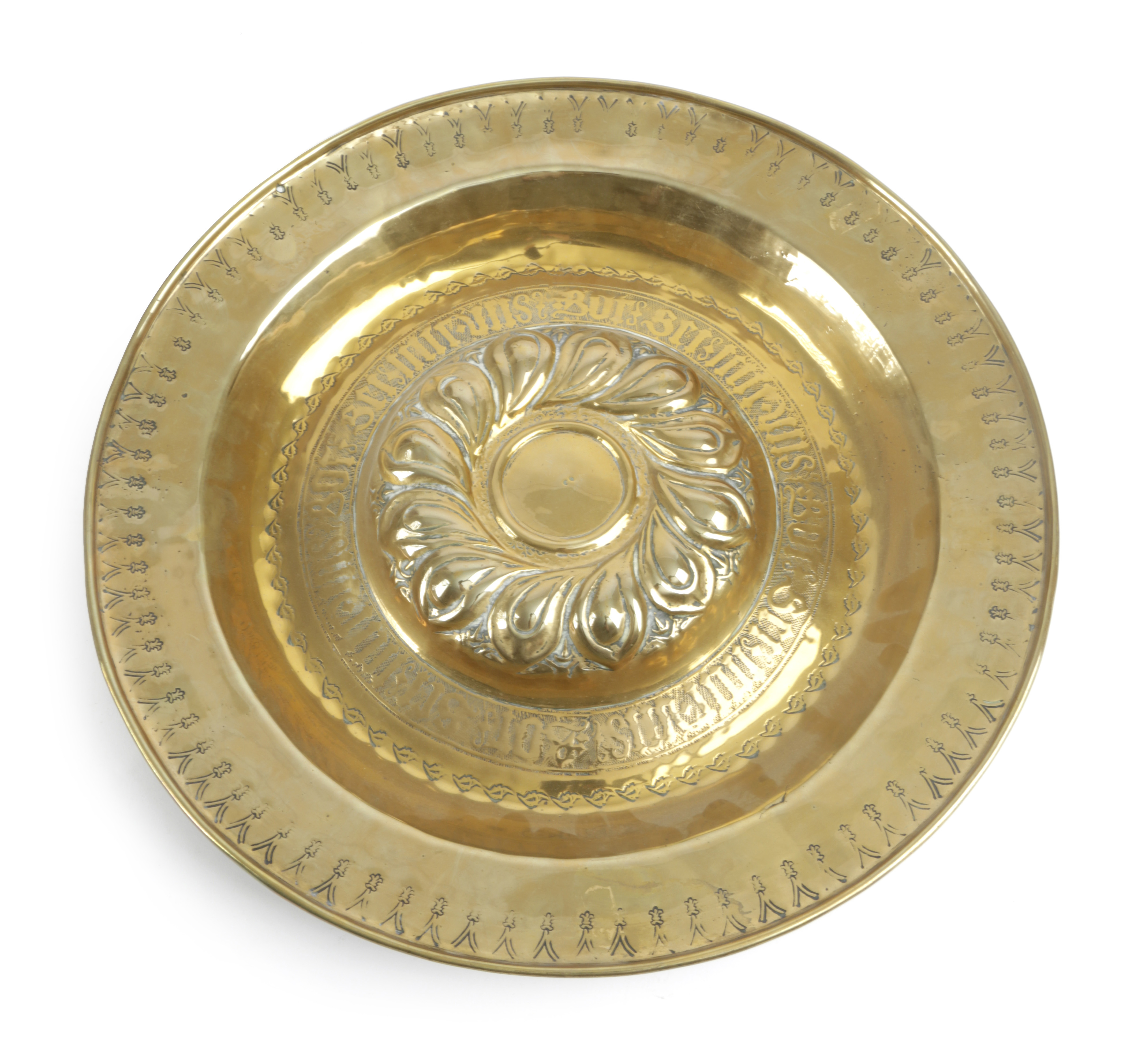 the centre with a repoussé whorl, inside a border of Gothic script, the rim with punched arching fleur-de-lys decoration