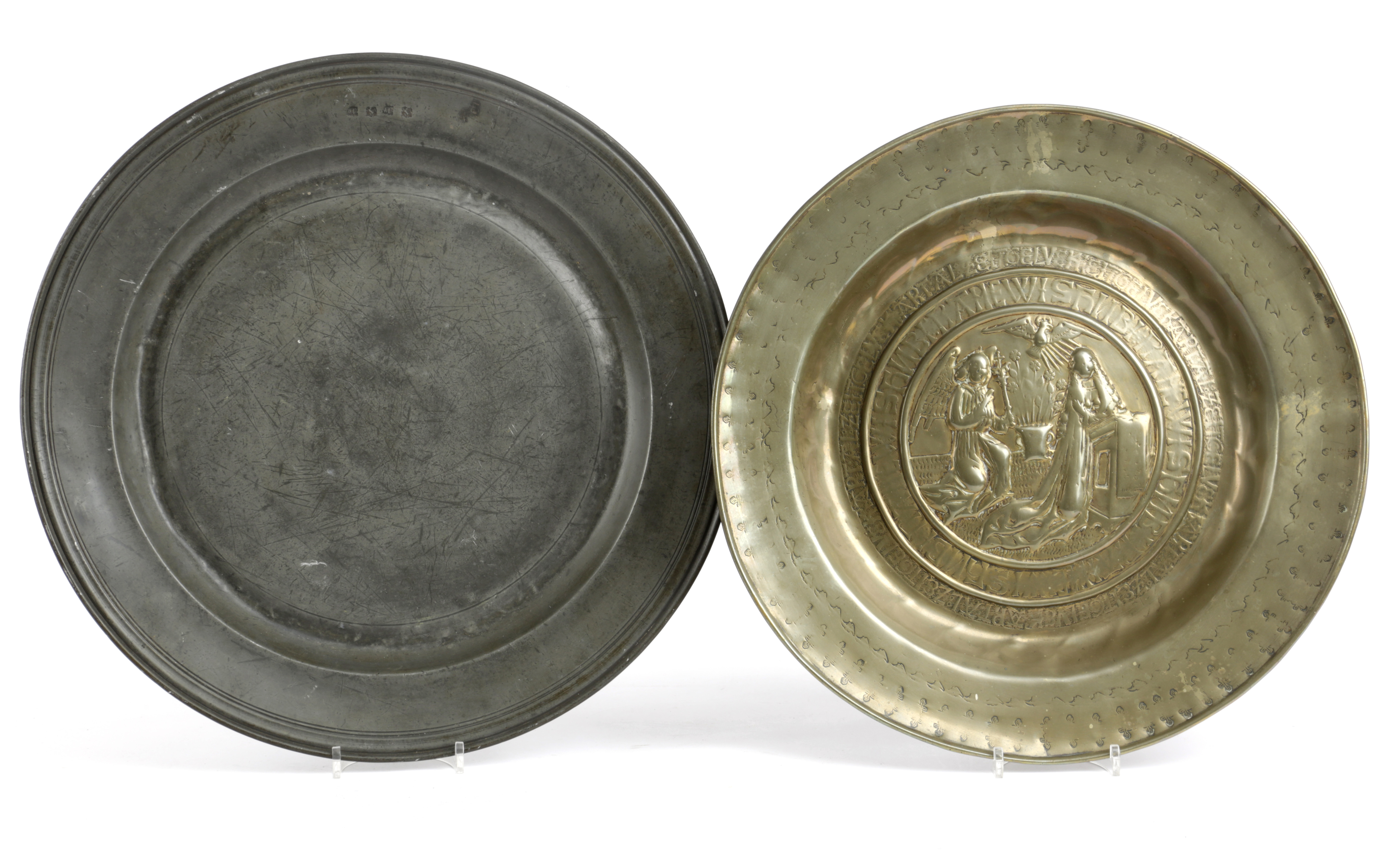 with four hallmarks to the rim, for William Banckes (fl. 1670-1693), (PS20), together with a Nuremberg brass alms dish with a central scene of the Annunciation inside two bands of script, the border with three bands of punched decoration (2)
