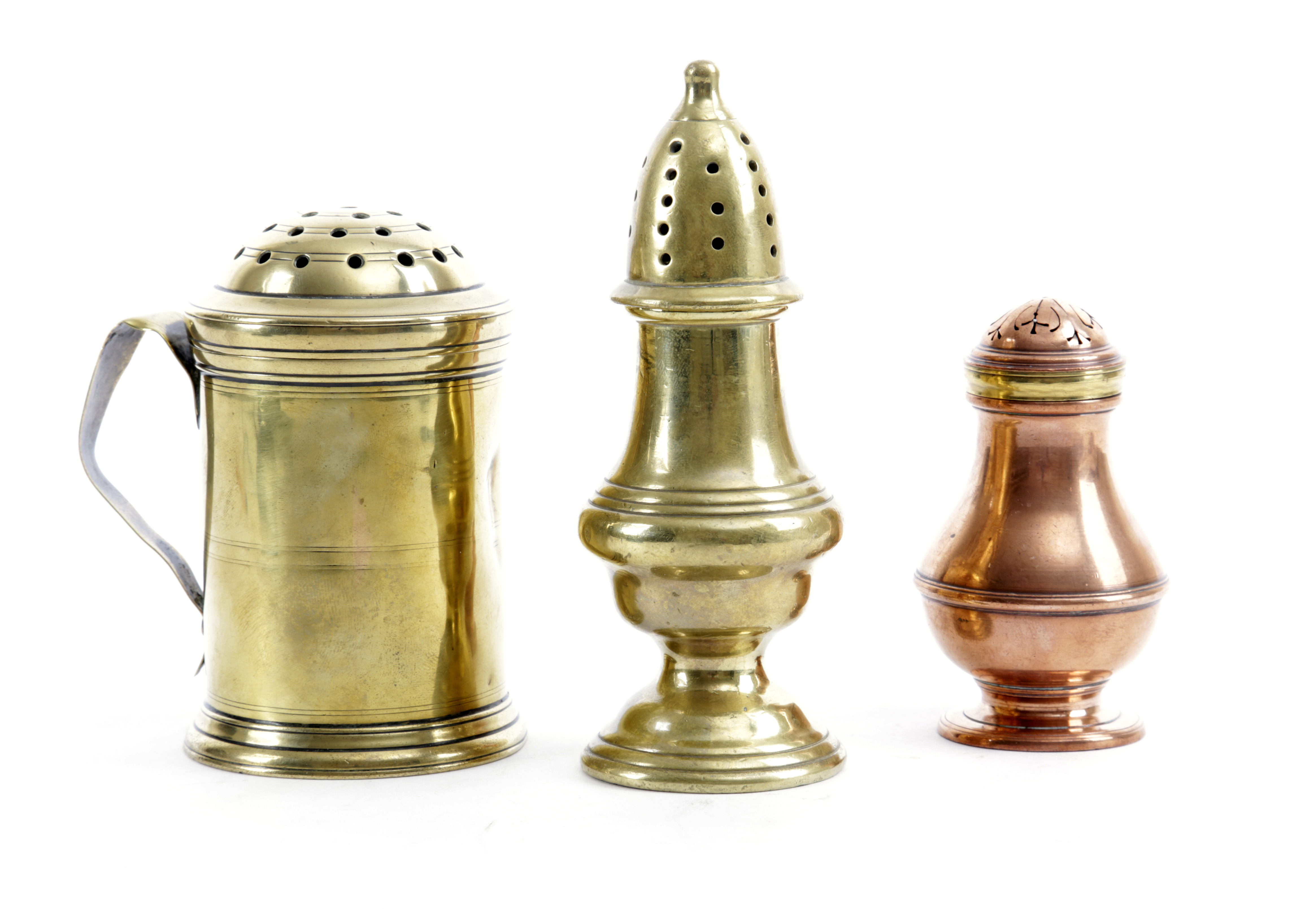 of baluster form with banded decoration, together with a copper and brass pepper caster and a brass dredger (3)