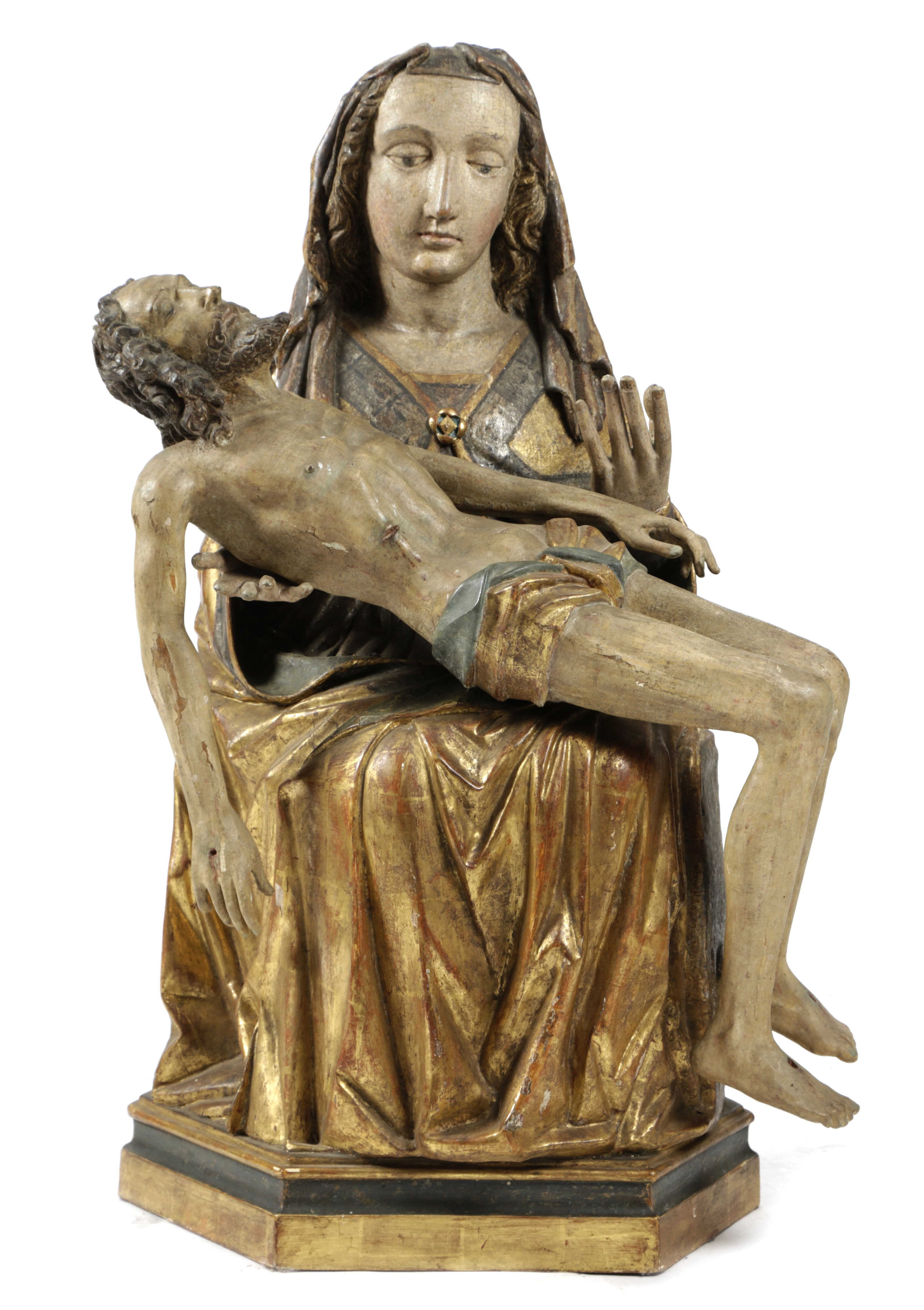AN OUTSTANDING AND LARGE 15TH CENTURY CARVED AND POLYCHROME FIGURAL PIETA GROUP