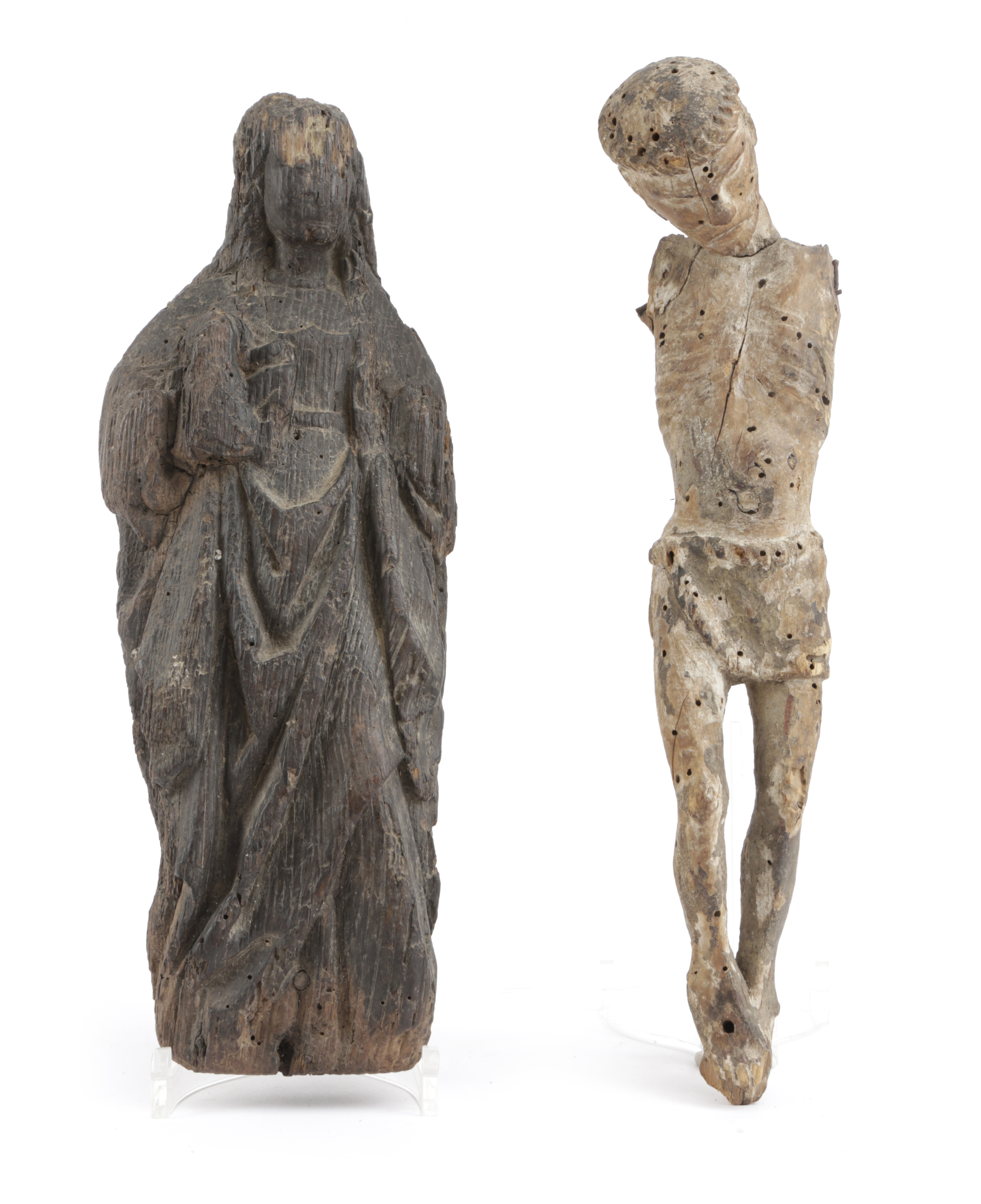 with remains of painted decoration, together with a late Medieval oak figure of a lady with plaited hair (2)