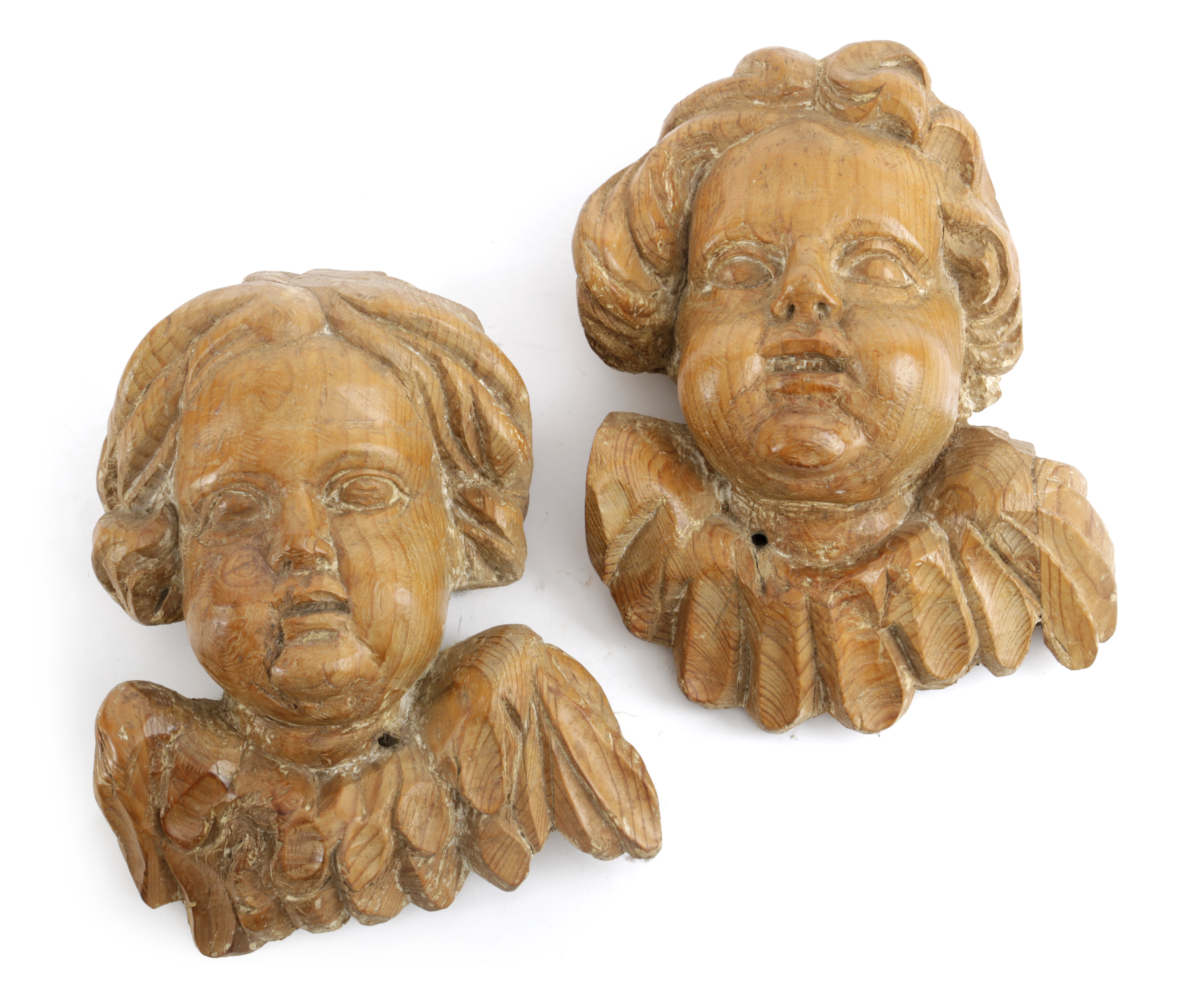 A PAIR OF ITALIAN BAROQUE CARVED PINE CHERUB HEADS